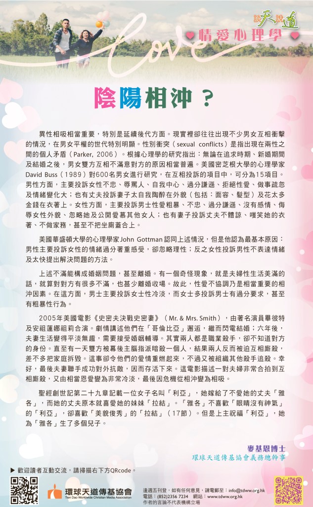 異性相吸相當重要,特別是延續後代方面。現實裡卻往往出現不少男女互相衝擊的情況,在男女平權的世代特別明顯。性別衝突(sexual conflicts)是指出現在兩性之間的個人矛盾(Parker,2006)。根據心理學的研究指出:無論在追求時期、新婚期間及結婚之後,男女雙方互相不滿意對方的原因相當普遍。美國密芝根大學的心理學家David Buss(1989)對600名男女進行研究,在互相投訴的項目中,可分為15項目。男性方面,主要投訴女性不忠、辱罵人、自我中心、過分謙遜、拒絕性愛、做事疏忽及情緒變化大;也有丈夫投訴妻子太自我陶醉在外貌(包括:面容、髮型)及花太多金錢在衣著上。女性方面,主要投訴男士性愛粗暴、不忠、過分謙遜、沒有感情、侮辱女性外貌、忽略她及公開愛慕其他女人;也有妻子投訴丈夫不體諒、嗤笑她的衣著、不做家務,甚至不把坐廁蓋合上。