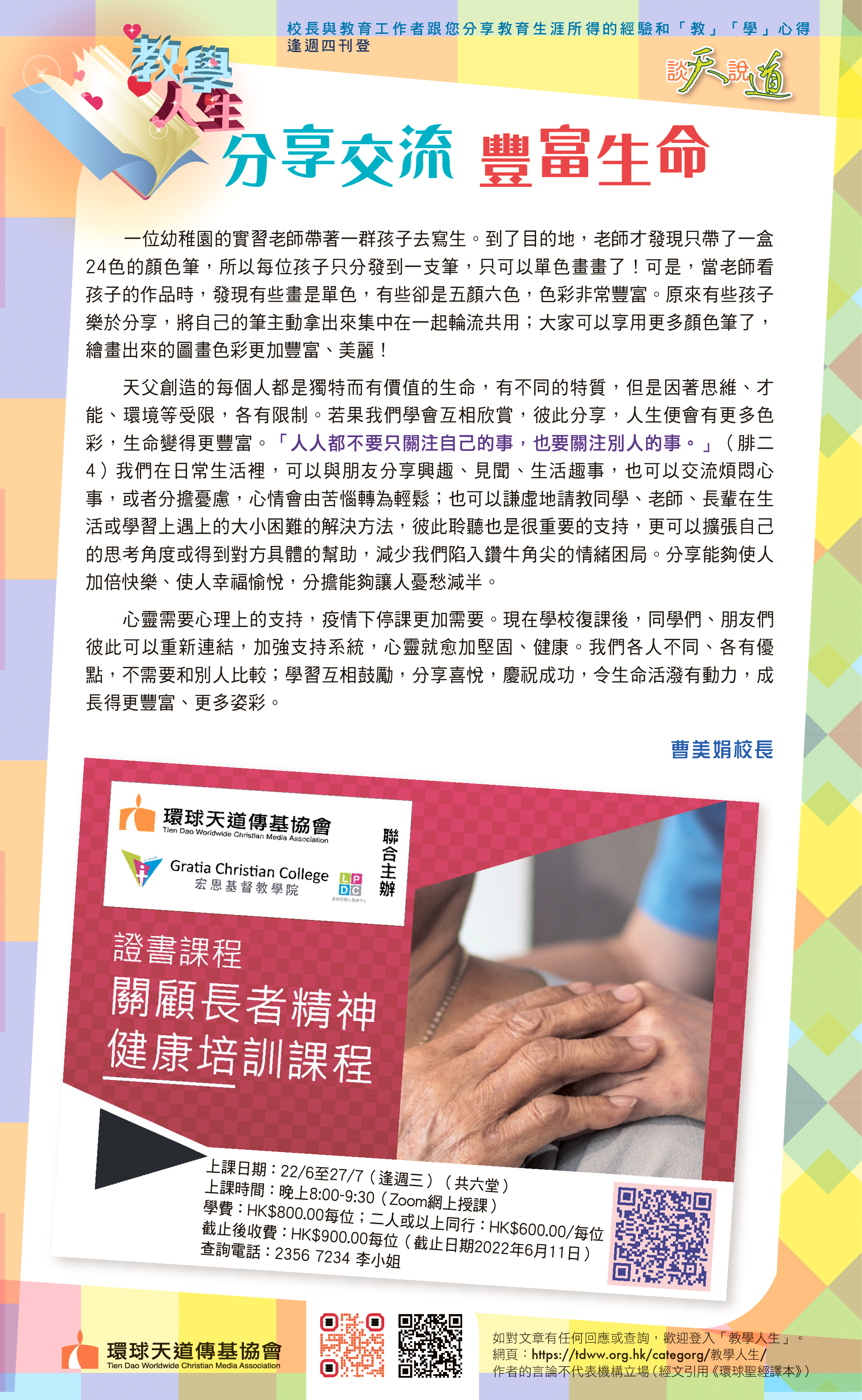心靈需要心理上的支持,疫情下停課更加需要。現在學校復課後,同學們、朋友們彼此可以重新連結,加強支持系統,心靈就愈加堅固、健康。我們各人不同、各有優點,不需要和別人比較;學習互相鼓勵,分享喜悅,慶祝成功,令生命活潑有動力,成長得更豐富、更多姿彩。