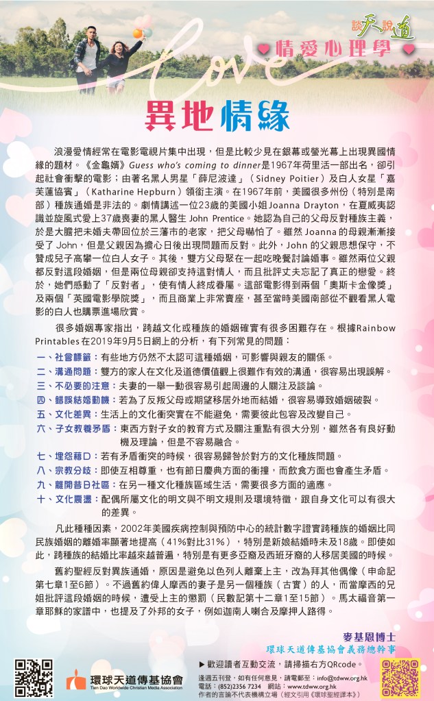 很多婚姻專家指出,跨越文化或種族的婚姻確實有很多困難存在。根據Rainbow Printables在2019年9月5日網上的分析,有下列常見的問題: