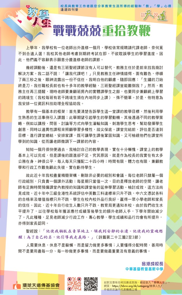 幾經調動後,還是有三班聖經課節沒有人可以替代,教務主任於是前來找我商討解決方案。我二話不說:「讓我代課吧!」只見教務主任神情錯愕、面有難色,停頓了兩三秒之後,眼神流露出一份不信任。我明白他的顧慮,隨即回應:「生鏽的刀始終是刀。我任職校長前也有十多年的教學經驗,三班聖經課豈能難倒我?」然而,教務主任再三提醒,現時老師要兼顧班房內的實體課學生之餘,也要同步兼顧網上學習的跨境生(我校每班有若干跨境生須在內地同步上課),殊不簡單。於是,他特意為我安排一位資訊科技助理全程協助我。