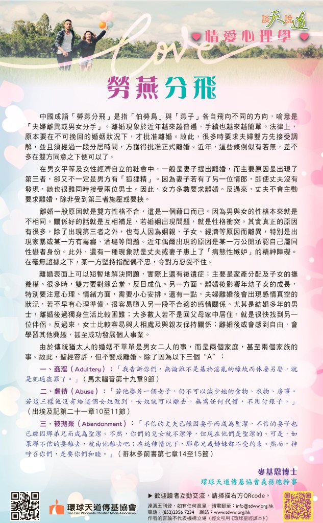 三、被拋棄(Abandonment):「不信的丈夫已經因妻子而成為聖潔,不信的妻子也已經因那弟兄而成為聖潔。不然,你們的兒女就不潔淨,但現在他們是聖潔的。可是,如果那不信的要離去,就由他離去吧;在這種情況下,那弟兄或姊妹都不受約束。然而,神呼召你們,是要你們和睦。」(哥林多前書第七章14至15節)