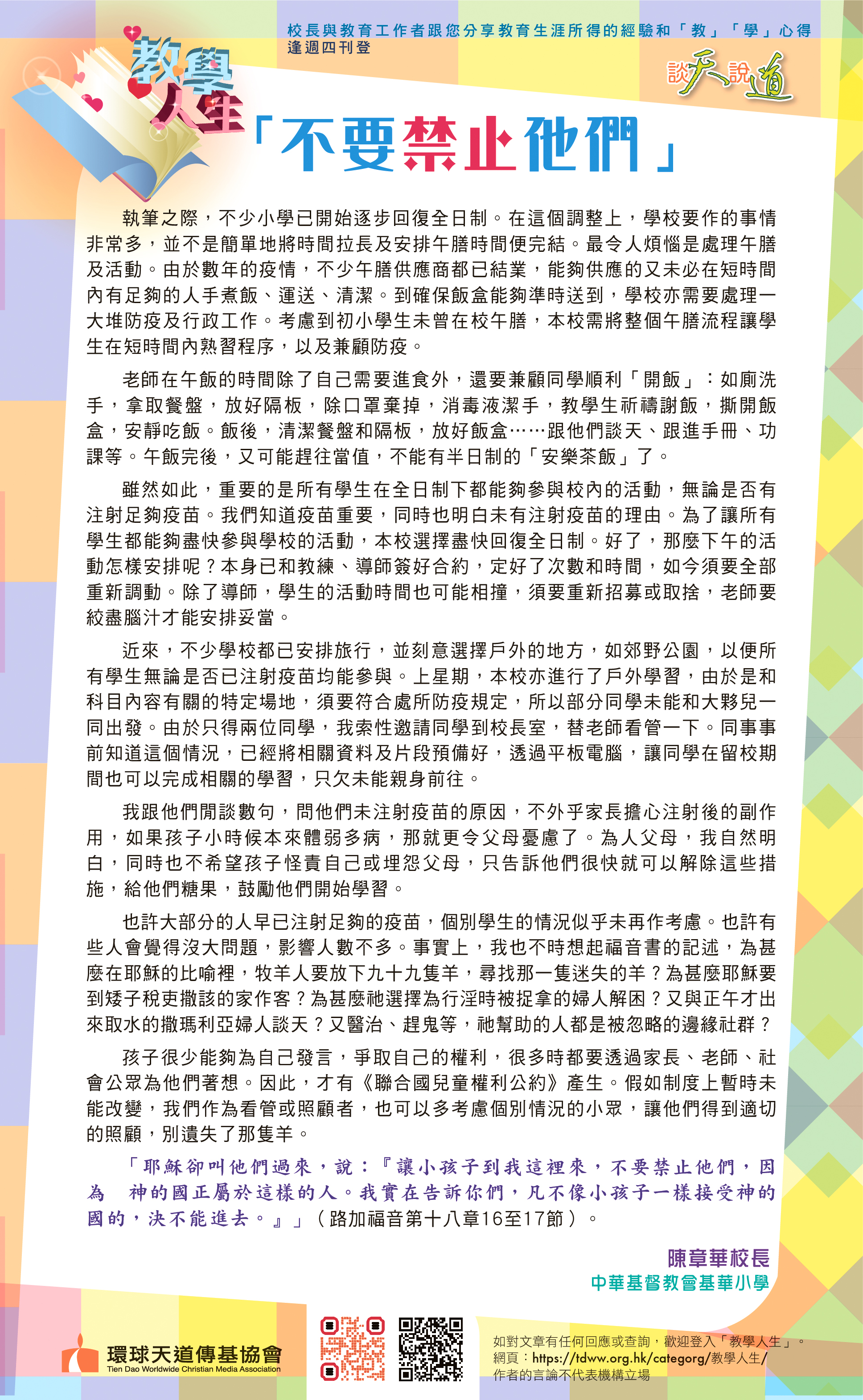 也許大部分的人早已注射足夠的疫苗,個別學生的情況似乎未再作考慮。也許有些人會覺得沒大問題,影響人數不多。事實上,我也不時想起福音書的記述,為甚麼在耶穌的比喻裡,牧羊人要放下九十九隻羊,尋找那一隻迷失的羊?為甚麼耶穌要到矮子稅吏撒該的家作客?為甚麼祂選擇為行淫時被捉拿的婦人解困?又與正午才出來取水的撒瑪利亞婦人談天?又醫治、趕鬼等,祂幫助的人都是被忽略的邊緣社群?