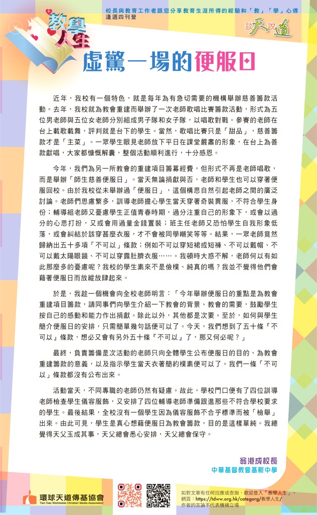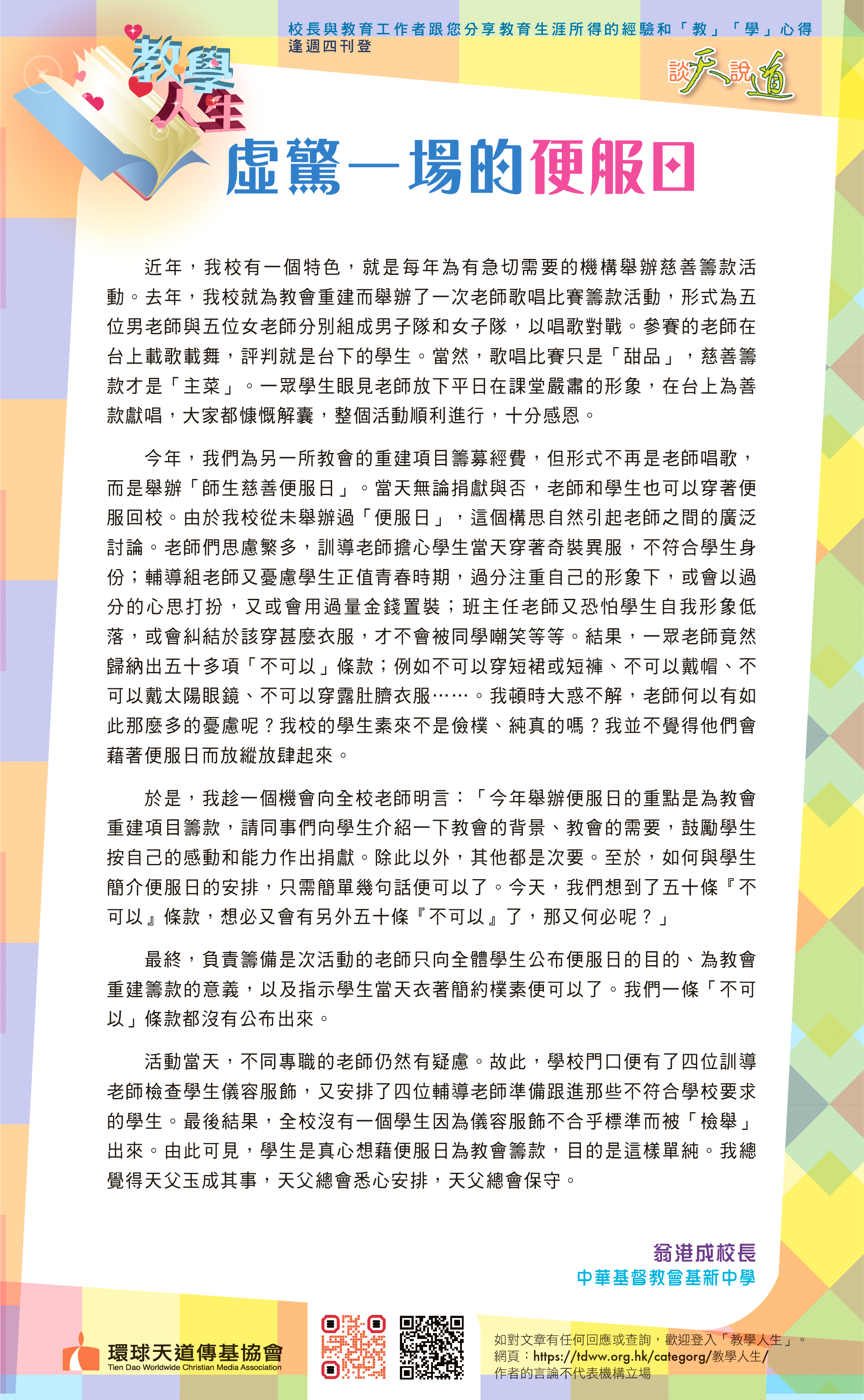 於是,我趁一個機會向全校老師明言:「今年舉辦便服日的重點是為教會重建項目籌款,請同事們向學生介紹一下教會的背景、教會的需要,鼓勵學生按自己的感動和能力作出捐獻。除此以外,其他都是次要。至於,如何與學生簡介便服日的安排,只需簡單幾句話便可以了。今天,我們想到了五十條『不可以』條款,想必又會有另外五十條『不可以』了,那又何必呢?」