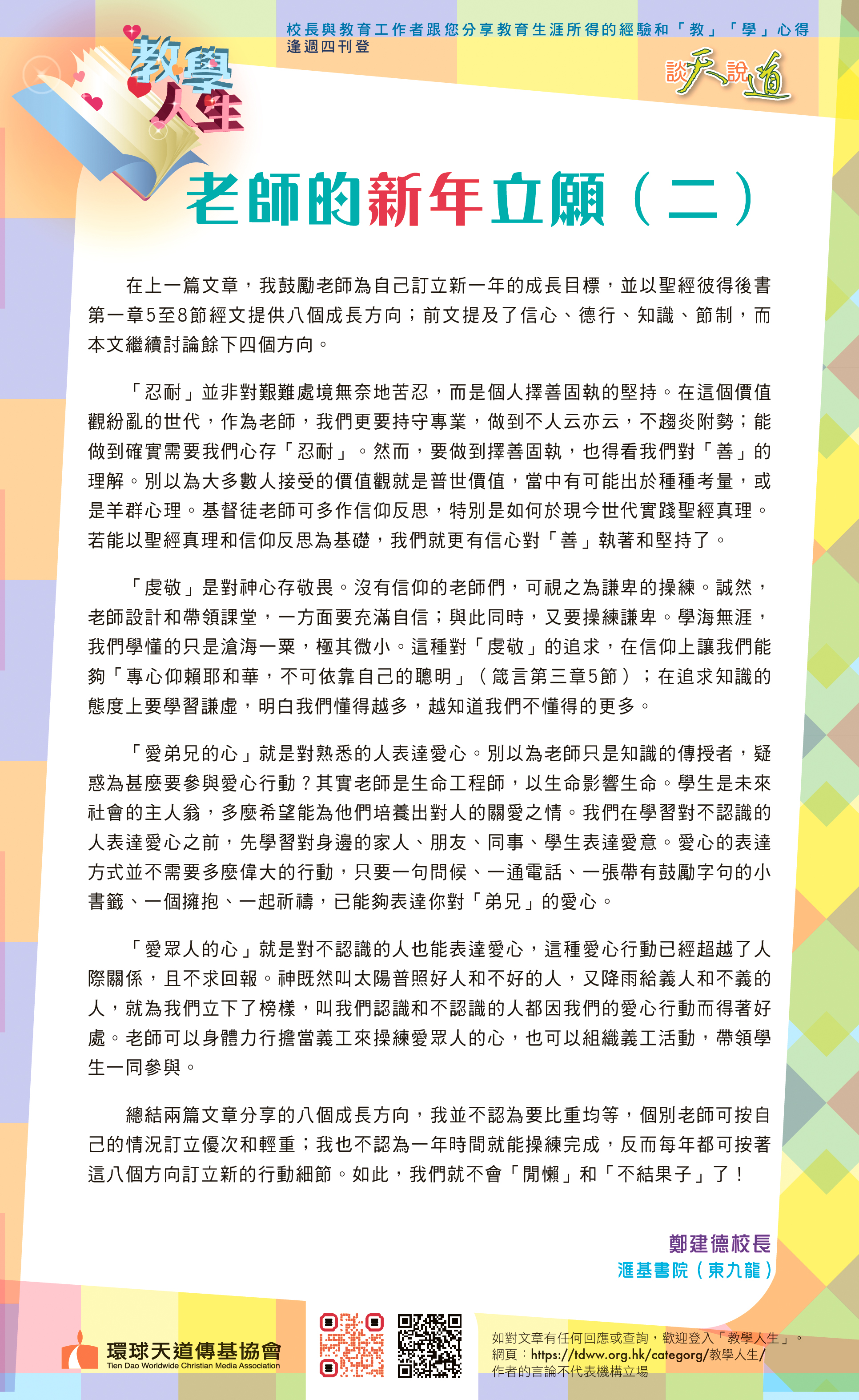 在上一篇文章,我鼓勵老師為自己訂立新一年的成長目標,並以聖經彼得後書第一章5至8節經文提供八個成長方向;前文提及了信心、德行、知識、節制,而本文繼續討論餘下四個方向。