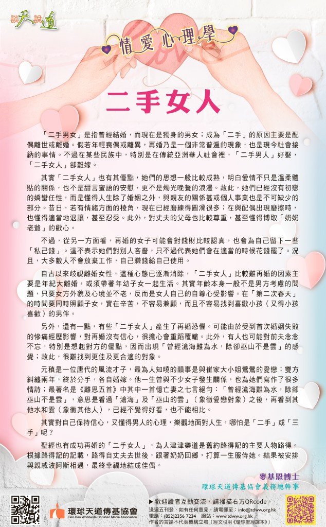 聖經也有成功再婚的「二手女人」,為人津津樂道是舊約路得記的主要人物路得。根據路得記的記載,路得自丈夫去世後,跟著奶奶回鄉,打算一生服侍她。結果被安排與親戚波阿斯相遇,幸福地結成佳偶。