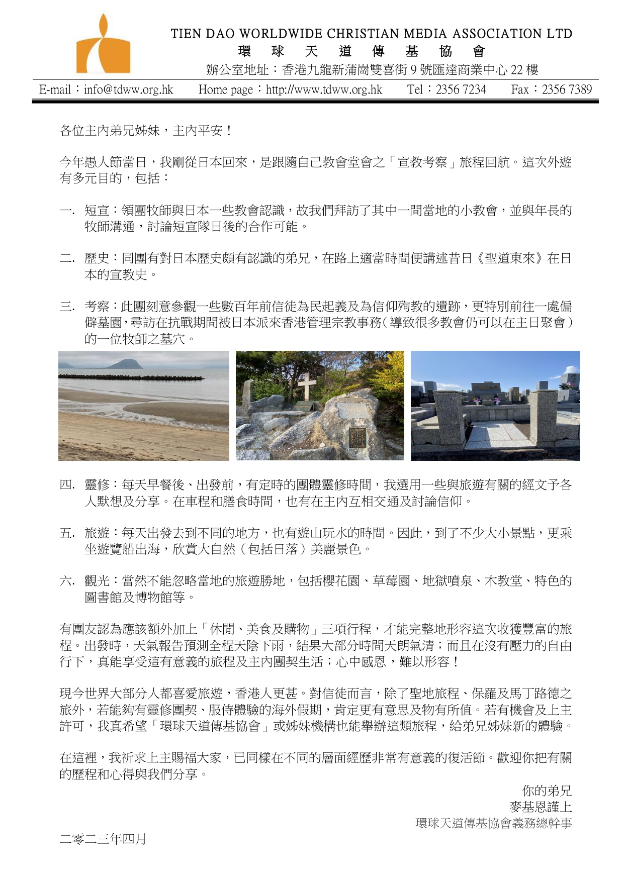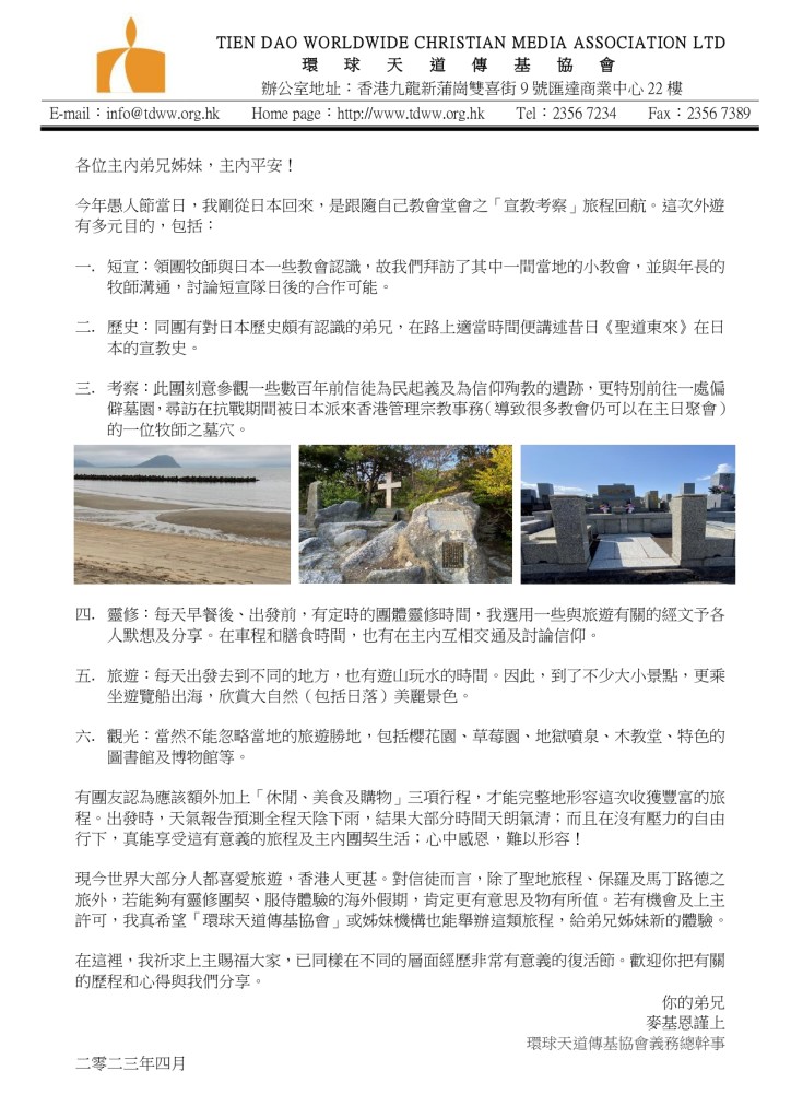 今年愚人節當日,我剛從日本回來,是跟隨自己教會堂會之「宣教考察」旅程回航。這次外遊有多元目的,包括: