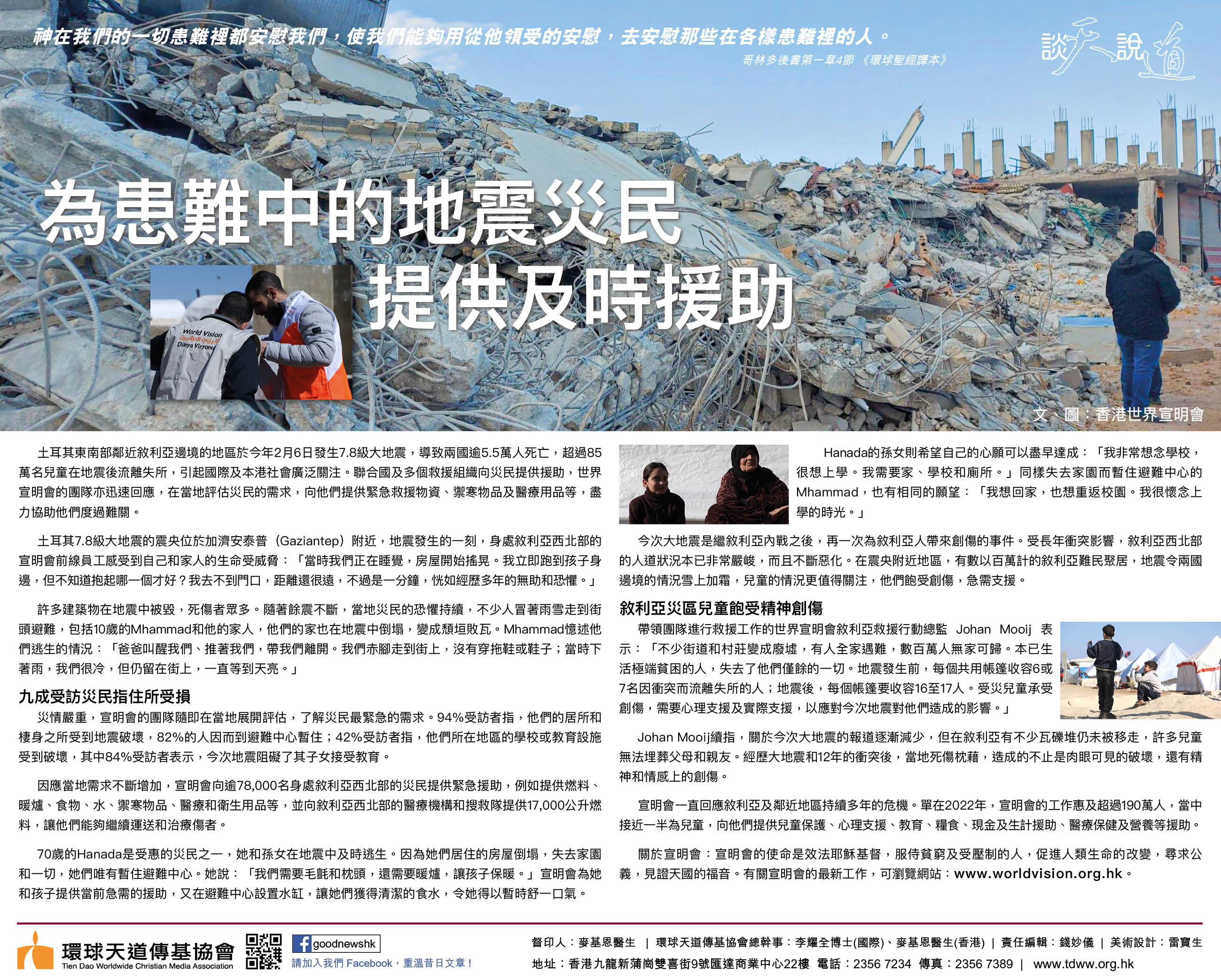 土耳其東南部鄰近敘利亞邊境的地區於今年2月6日發生7.8級大地震,導致兩國逾5.5萬人死亡,超過85萬名兒童在地震後流離失所,引起國際及本港社會廣泛關注。聯合國及多個救援組織向災民提供援助,世界宣明會的團隊亦迅速回應,在當地評估災民的需求,向他們提供緊急救援物資、禦寒物品及醫療用品等,盡力協助他們度過難關。