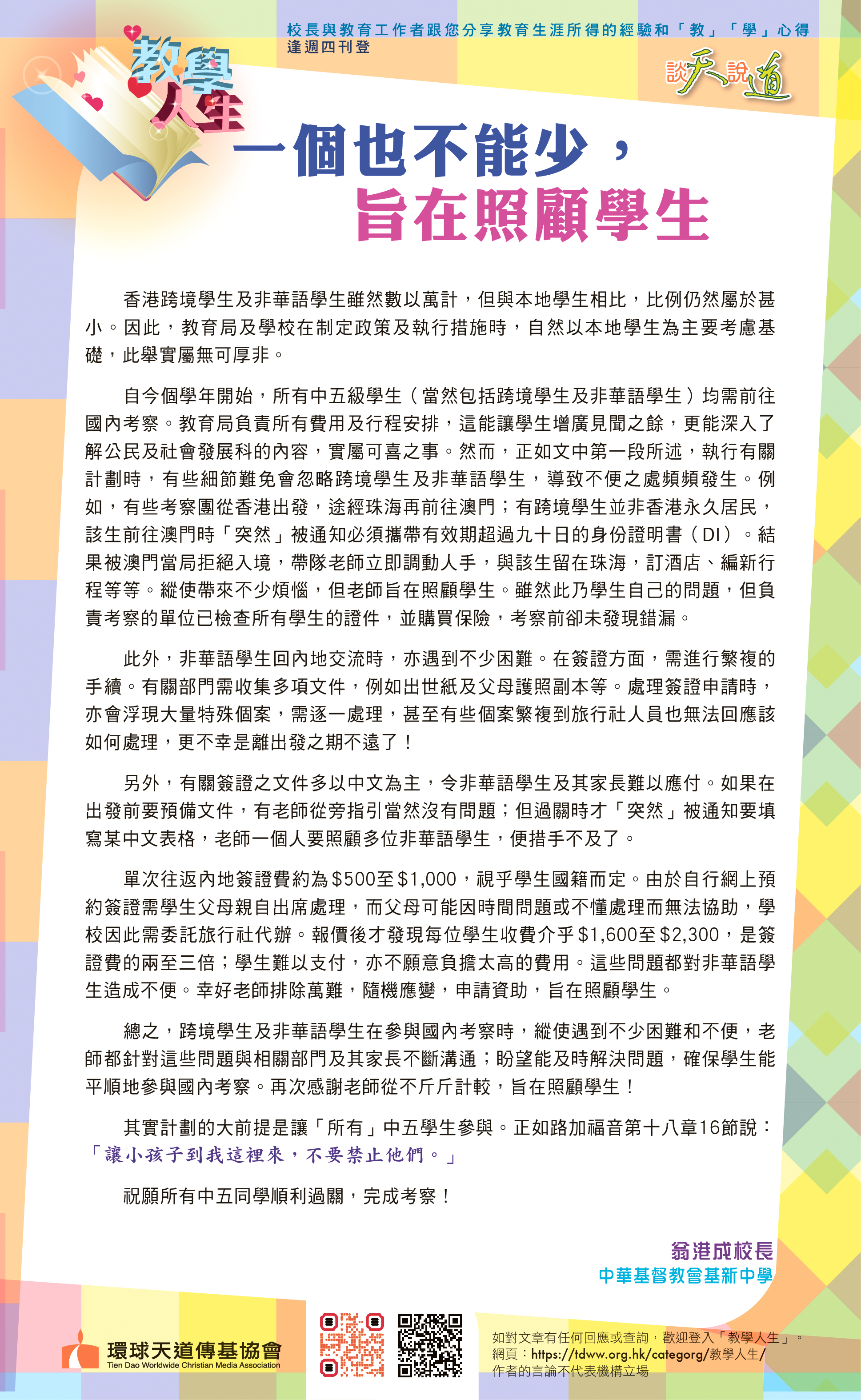 總之,跨境學生及非華語學生在參與國內考察時,縱使遇到不少困難和不便,老師都針對這些問題與相關部門及其家長不斷溝通;盼望能及時解決問題,確保學生能平順地參與國內考察。再次感謝老師從不斤斤計較,旨在照顧學生!