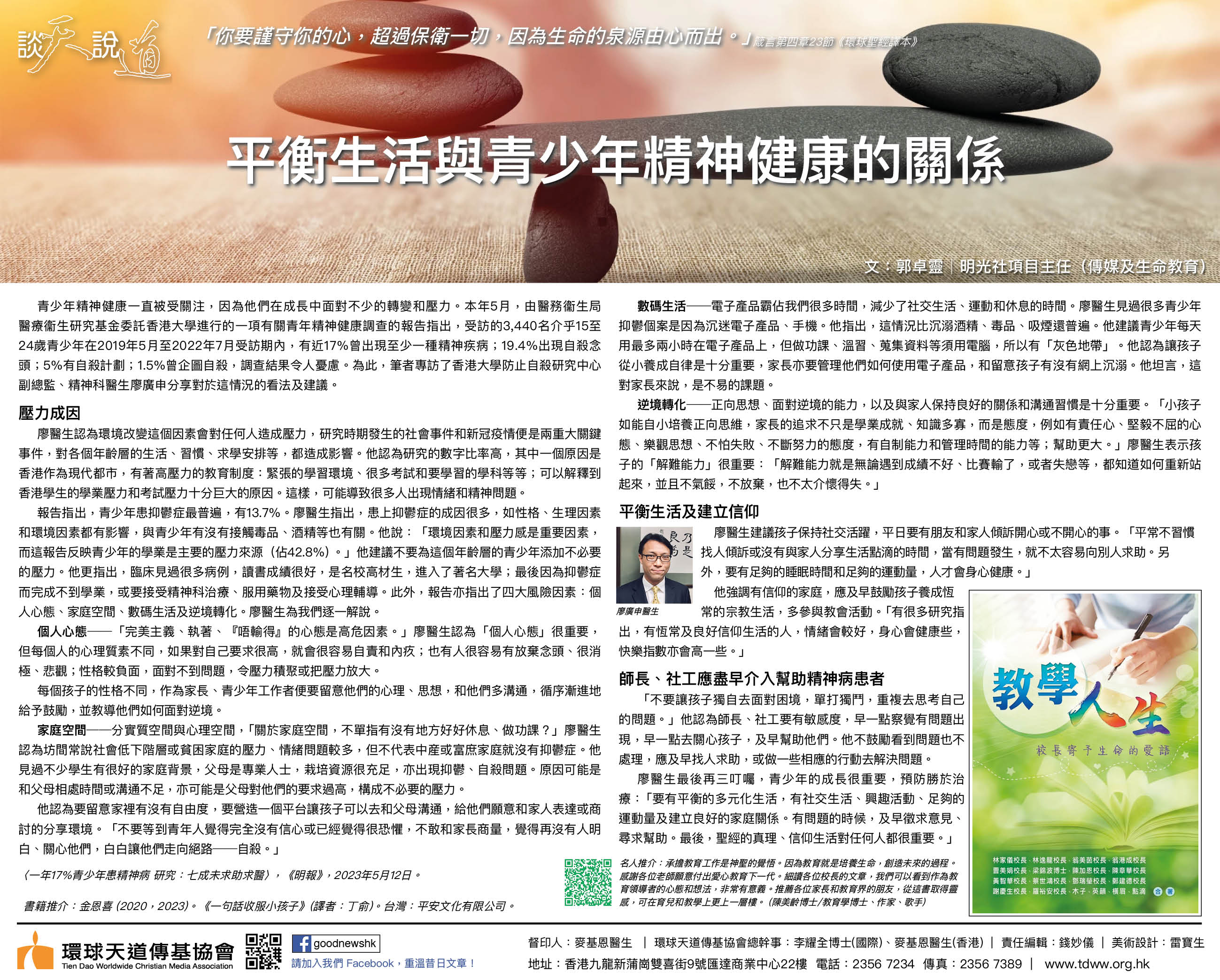 廖醫生最後再三叮囑,青少年的成長很重要,預防勝於治療:「要有平衡的多元化生活,有社交生活、興趣活動、足夠的運動量及建立良好的家庭關係。有問題的時候,及早徵求意見、尋求幫助。最後,聖經的真理、信仰生活對任何人都很重要。」