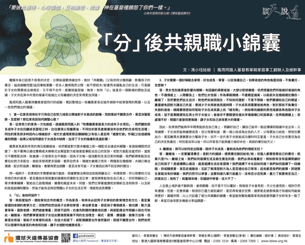 人生路上或許會不斷跌倒,會很艱難,但不是不可以嘗試。我相信子女會見到,天父也會見到;或許仍然有遺憾,但是一定會美麗。相信你已盡力做到最好,是否再有進步空間,通常是走過那條路才知道如何能做得更好。篇幅所限,以上只記載了部分共親職的錦囊。希望能夠幫助離異家長與前度照顧子女時有多一點了解,希望日後有更多機會分享這課題。