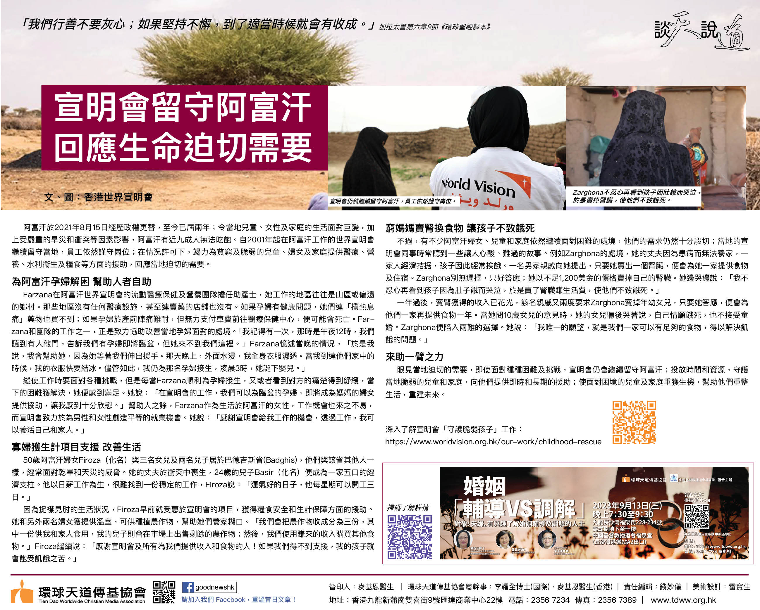 阿富汗於2021年8月15日經歷政權更替,至今已屆兩年;令當地兒童、女性及家庭的生活面對巨變,加上受嚴重的旱災和衝突等因素影響,阿富汗有近九成人無法吃飽。自2001年起在阿富汗工作的世界宣明會繼續留守當地,員工依然謹守崗位;在情況許可下,竭力為貧窮及脆弱的兒童、婦女及家庭提供醫療、營養、水利衞生及糧食等方面的援助,回應當地迫切的需要。