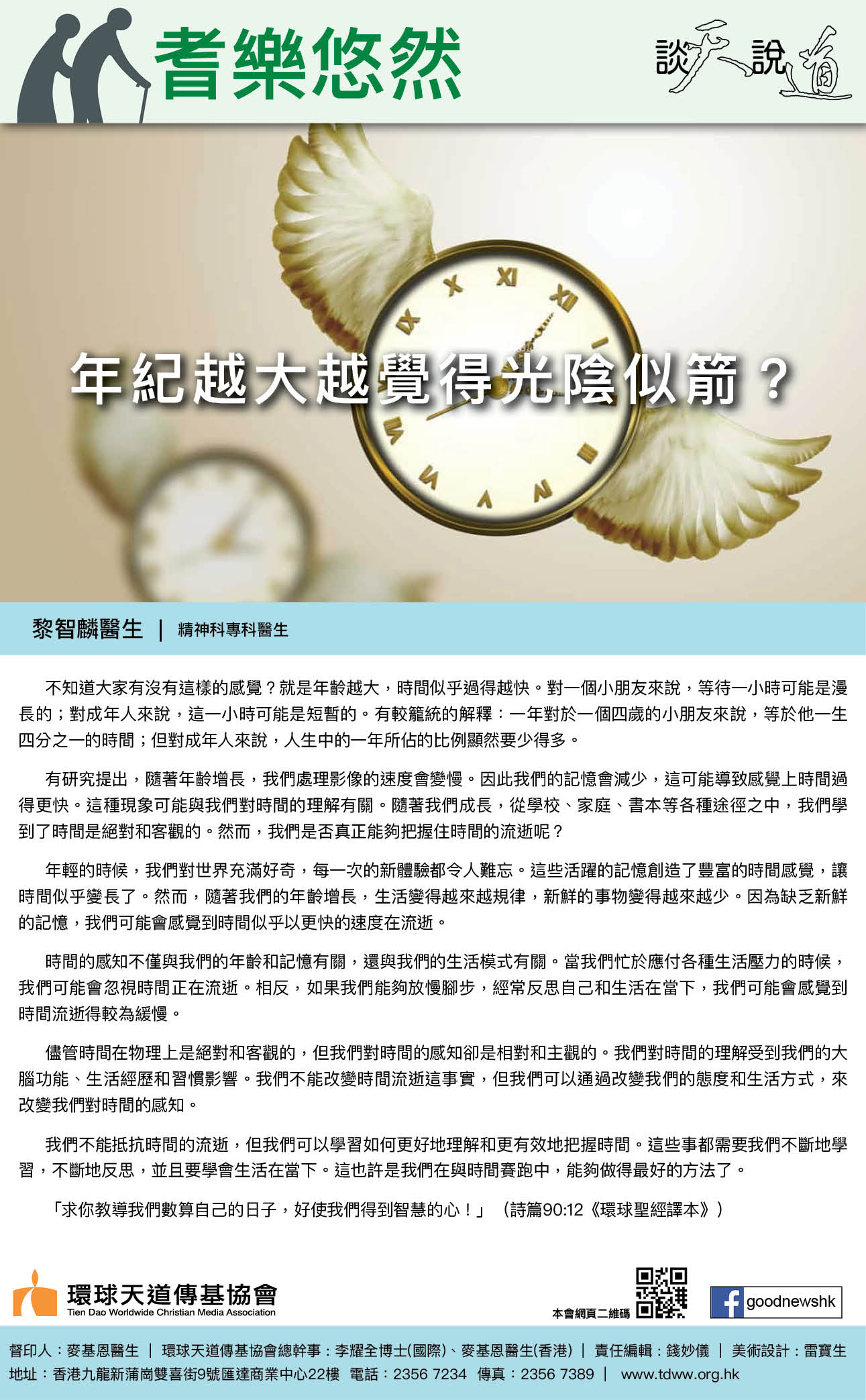 不知道大家有沒有這樣的感覺?就是年齡越大,時間似乎過得越快。對一個小朋友來說,等待一小時可能是漫長的;對成年人來說,這一小時可能是短暫的。有較籠統的解釋:一年對於一個四歲的小朋友來說,等於他一生四分之一的時間;但對成年人來說,人生中的一年所佔的比例顯然要少得多。