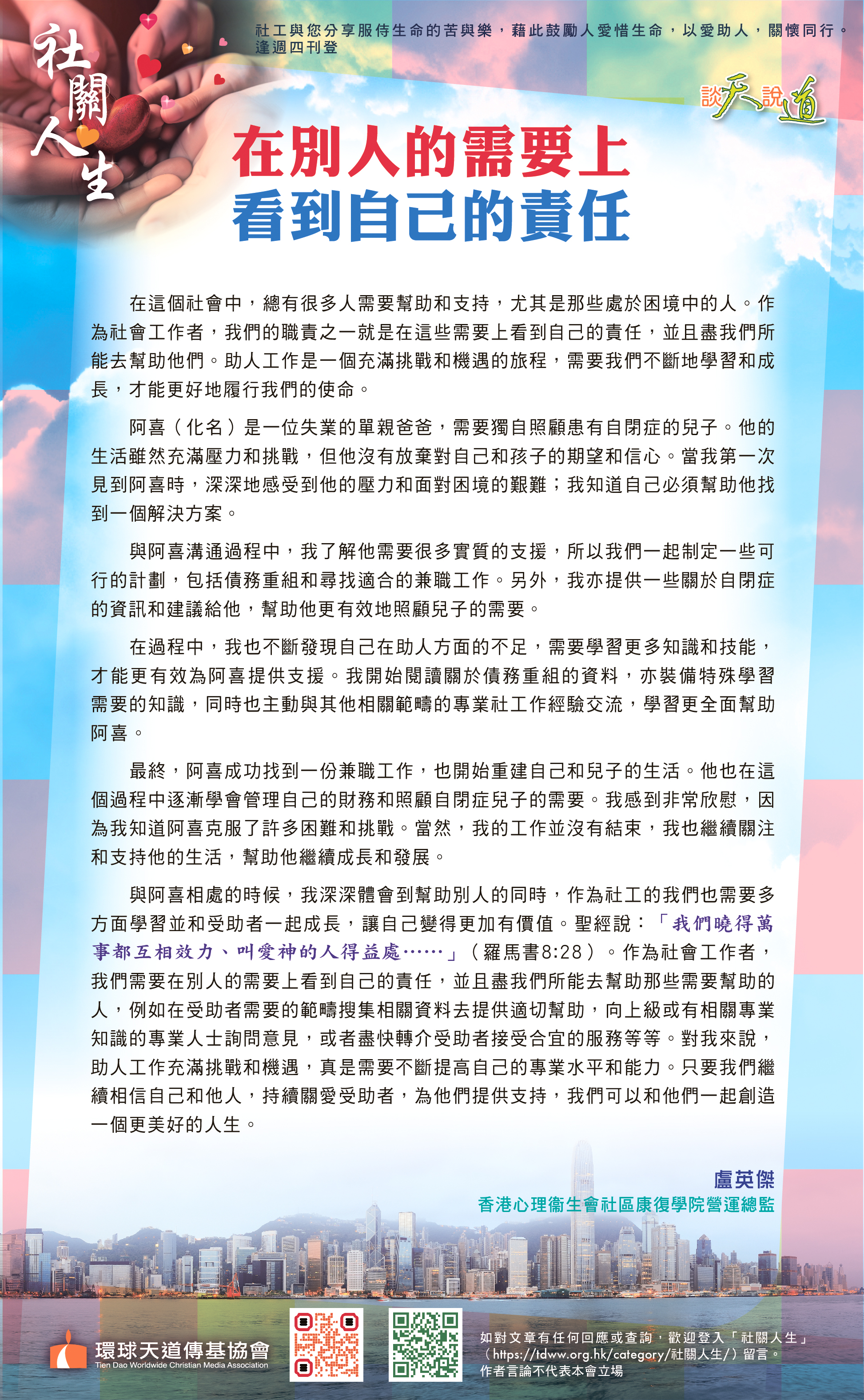 與阿喜相處的時候,我深深體會到幫助別人的同時,作為社工的我們也需要多方面學習並和受助者一起成長,讓自己變得更加有價值。聖經說:「我們曉得萬事都互相效力、叫愛神的人得益處……」(羅馬書8:28)。作為社會工作者,我們需要在別人的需要上看到自己的責任,並且盡我們所能去幫助那些需要幫助的人,例如在受助者需要的範疇搜集相關資料去提供適切幫助,向上級或有相關專業知識的專業人士詢問意見,或者盡快轉介受助者接受合宜的服務等等。對我來說,助人工作充滿挑戰和機遇,真是需要不斷提高自己的專業水平和能力。只要我們繼續相信自己和他人,持續關愛受助者,為他們提供支持,我們可以和他們一起創造一個更美好的人生。