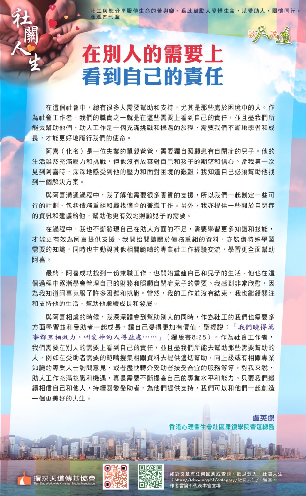 在這個社會中,總有很多人需要幫助和支持,尤其是那些處於困境中的人。作為社會工作者,我們的職責之一就是在這些需要上看到自己的責任,並且盡我們所能去幫助他們。助人工作是一個充滿挑戰和機遇的旅程,需要我們不斷地學習和成長,才能更好地履行我們的使命。