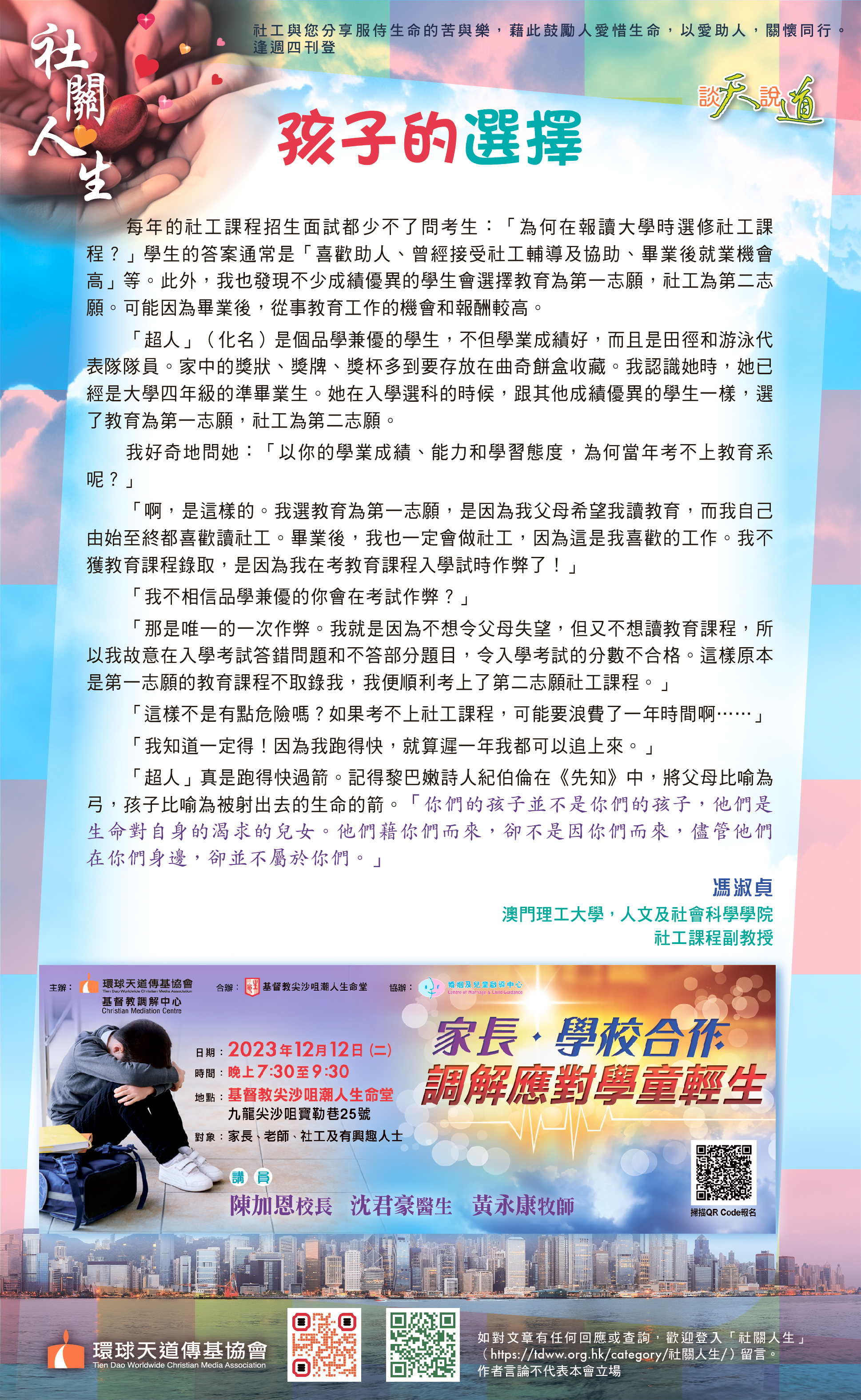 每年的社工課程招生面試都少不了問考生:「為何在報讀大學時選修社工課程?」學生的答案通常是「喜歡助人、曾經接受社工輔導及協助、畢業後就業機會高」等。此外,我也發現不少成績優異的學生會選擇教育為第一志願,社工為第二志願。可能因為畢業後,從事教育工作的機會和報酬較高。