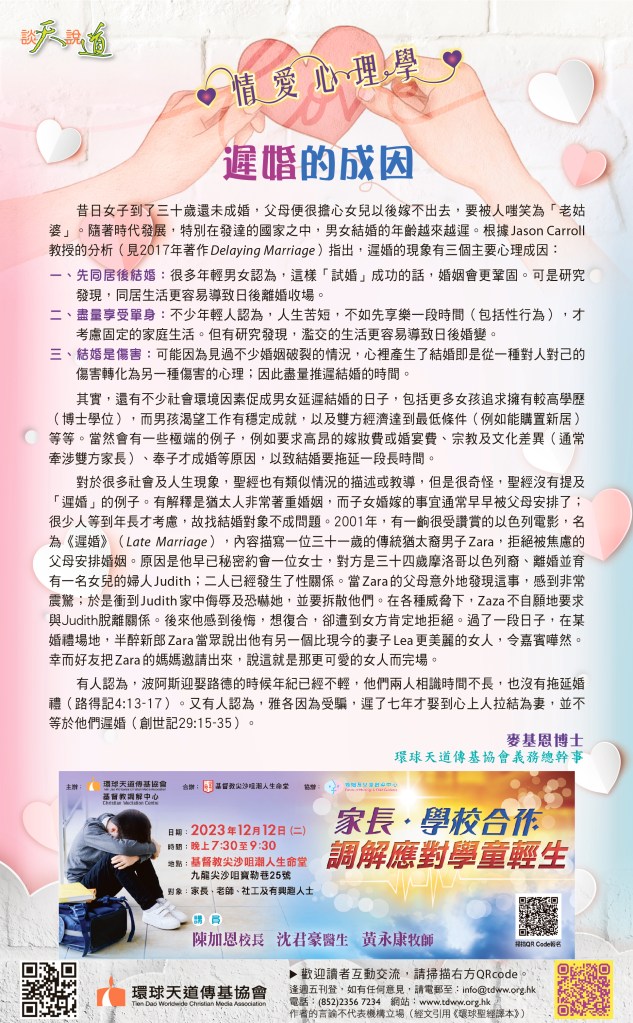 昔日女子到了三十歲還未成婚,父母便很擔心女兒以後嫁不出去,要被人嗤笑為「老姑婆」。隨著時代發展,特別在發達的國家之中,男女結婚的年齡越來越遲。根據Jason Carroll教授的分析(見2017年著作Delaying Marriage)指出,遲婚的現象有三個主要心理成因: