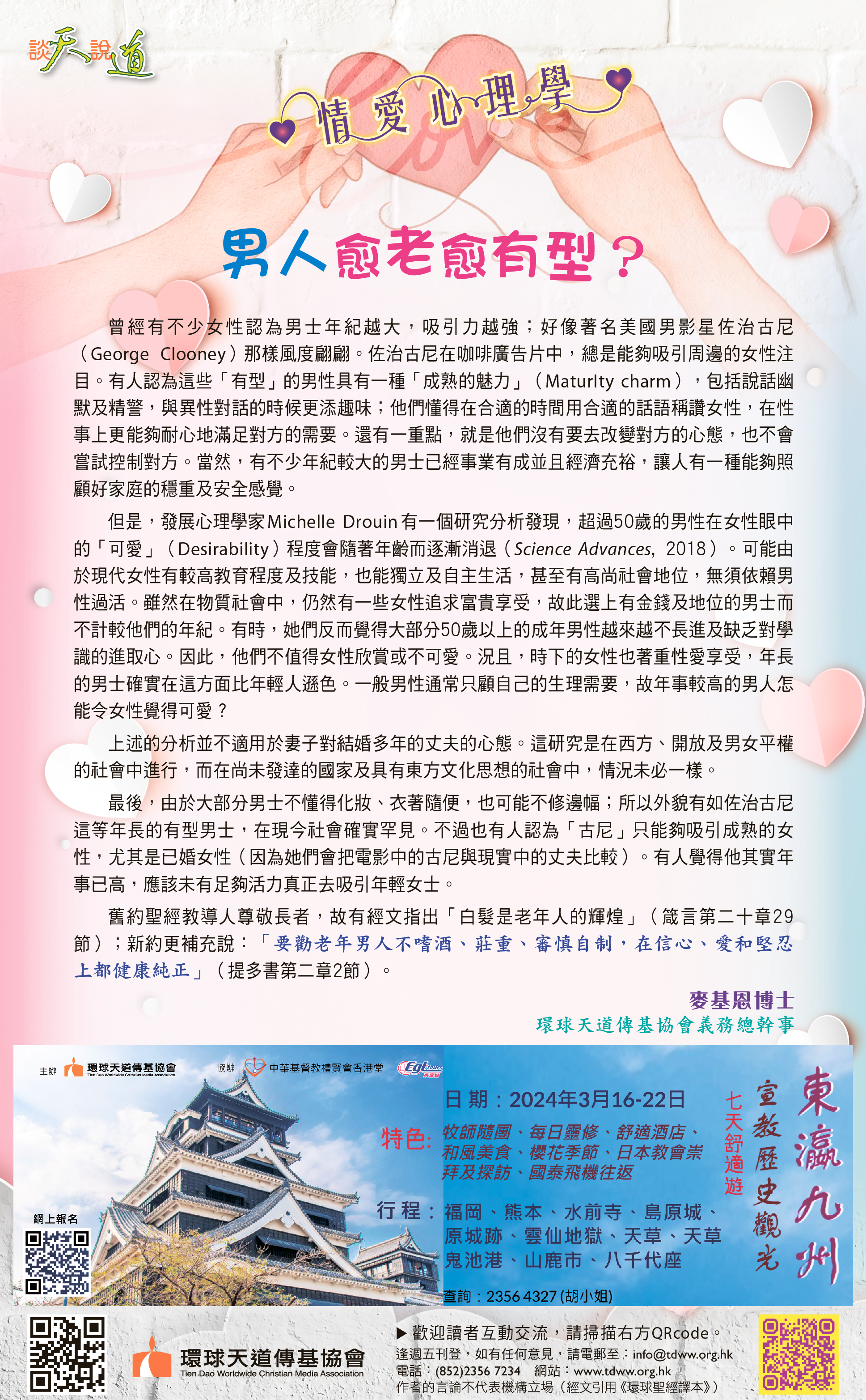 但是,發展心理學家Michelle Drouin有一個研究分析發現,超過50歲的男性在女性眼中的「可愛」(Desirability)程度會隨著年齡而逐漸消退(Science Advances, 2018)。可能由於現代女性有較高教育程度及技能,也能獨立及自主生活,甚至有高尚社會地位,無須依賴男性過活。雖然在物質社會中,仍然有一些女性追求富貴享受,故此選上有金錢及地位的男士而不計較他們的年紀。有時,她們反而覺得大部分50歲以上的成年男性越來越不長進及缺乏對學識的進取心。因此,他們不值得女性欣賞或不可愛。況且,時下的女性也著重性愛享受,年長的男士確實在這方面比年輕人遜色。一般男性通常只顧自己的生理需要,故年事較高的男人怎能令女性覺得可愛?