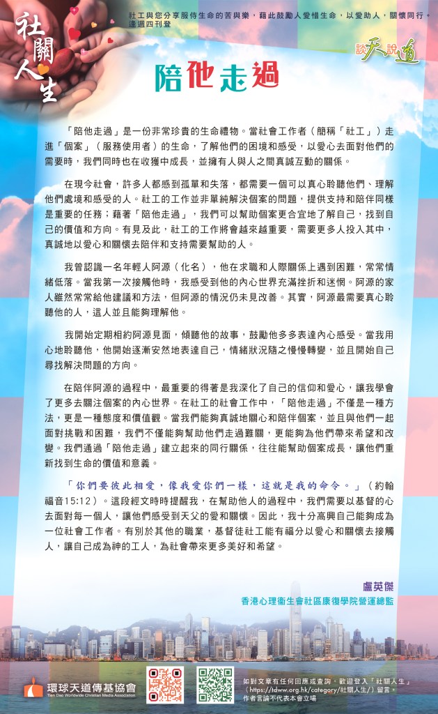 「陪他走過」是一份非常珍貴的生命禮物。當社會工作者(簡稱「社工」)走進「個案」(服務使用者)的生命,了解他們的困境和感受,以愛心去面對他們的需要時,我們同時也在收獲中成長,並擁有人與人之間真誠互動的關係。