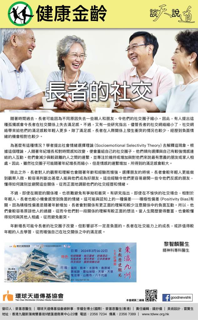 年齡增長可能令長者的社交圈子改變,但影響卻不一定是負面的。長者在社交能力上的成長,或許值得較年輕的人去學習,從而增強自己在社交關係之中的滿足感。