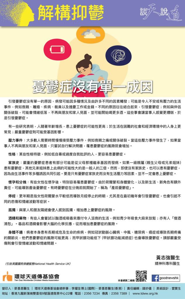 引發憂鬱症沒有單一的原因,病發可能因多種情況及由許多不同的因素觸發;可能是令人不安或有壓力的生活事件,例如喪親、離婚、疾病、裁員以及擔憂工作或金錢。不同的原因往往結合起來,引發憂鬱症;例如與伴侶關係破裂,可能會情緒低落,不再與朋友和家人見面,並可能開始喝更多酒。這些事會讓當事人感覺更糟糕,於是引發憂鬱症。