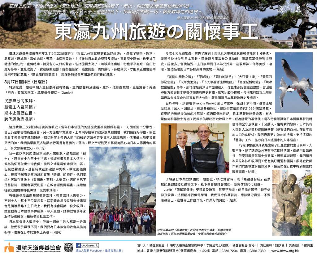 環球天道傳基協會在本年3月16至22日舉辦了「東瀛九州宣教歷史觀光舒適遊」,遊覽了福岡、熊本、島原城、原城跡、雲仙地獄、天草、山鹿市等地,主打參加日本教會崇拜及探訪、宣教歷史觀光,也安排了舒適的食住行。宣傳時期,聽見各方友好的聲音,包括旅費太高了、可以乘搭廉航、行程平平無奇、自由行更好等等。意見收到了,實在感謝迴響;經衡量細節,適當調整,終於成行。身歷其境,才能真正體會箇中與別不同的意義,「點止旅行咁簡單?」現在是時候分享團友們旅行後的感想。