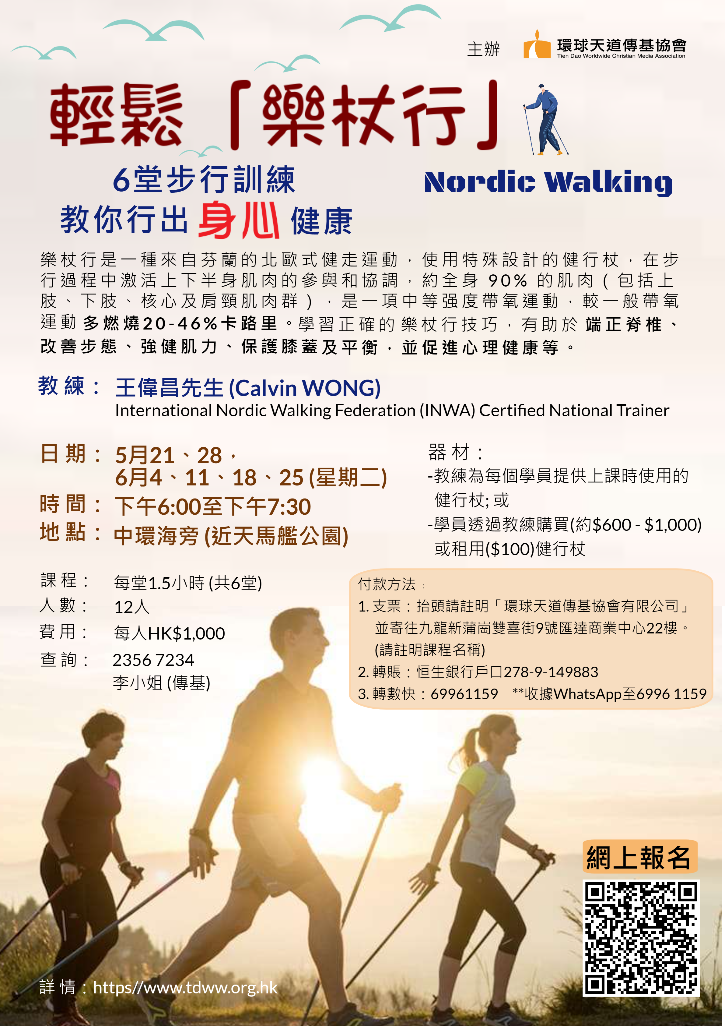 樂杖行是一種來自芬蘭的北歐式健走運動,使用特殊設計的健行杖,在步行過程中激活上下半身肌肉的協參與和調和,約全身 90% 的肌肉(包括上肢、下肢、核心及肩頸肌肉群),是一項中等强度帶氧運動,較一般帶氧運動多燃燒20-46%卡路里。學習正確的樂杖行技巧,有助於端正脊椎、改善步態、強健肌力、保護膝蓋及平衡,並促進心理健康等。