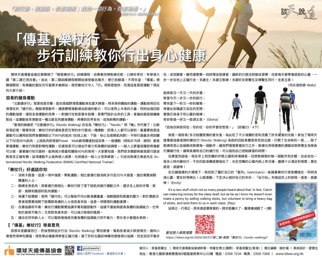 我是一個容易/多次肢體受傷的冒失鬼,為此吃了不少身體的苦和浪費了許多寶貴的光陰!參加了環球天道傳基協會首辦的樂杖行(Nordic Walking)為我的四肢身體受苦找到出路,打開了生命新的一頁……除了教練很悉心並細緻地教導每一個動作,讓我們慢慢掌握技巧之外,教練也用很優惠的價錢收取學費及為學員代購健行杖。讓學員擁有自己的健行杖,可以個別自己控制練習的時間。