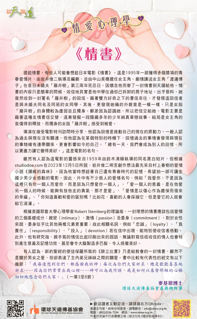 提起情書,有些人可能會想起日本電影《情書》。這是1995年一部獲得多個獎項的青春愛情片,由岩井俊二執導及編劇,並由中山美穗擔任女主角。劇情講述女主角「渡邊博子」在昔日未婚夫「藤井樹」第三周年死忌日,因懷念他而寄了一封情書到天國給他。情書的內容只是簡單的問候,收信地其實是他中學住過但已拆卸的房子地址。出乎意料,她竟然收到一封署名「藤井樹」的回信。藉著雙方好奇之下的書信來往,才發現這回信者是與未婚夫同名及同班的女同學。其後,更發現她倆的外貌竟是一模一樣,只是女版「藤井樹」的身體較為虛弱並且獨身。郵差因為認識她,所以把信交給她。電影主要是藉著這種友情書信交替,逐漸發掘一段隱藏多年的少年純真單戀故事。結局是女主角的哀傷得到釋放,而獨身的女版「藤井樹」感受到被愛。