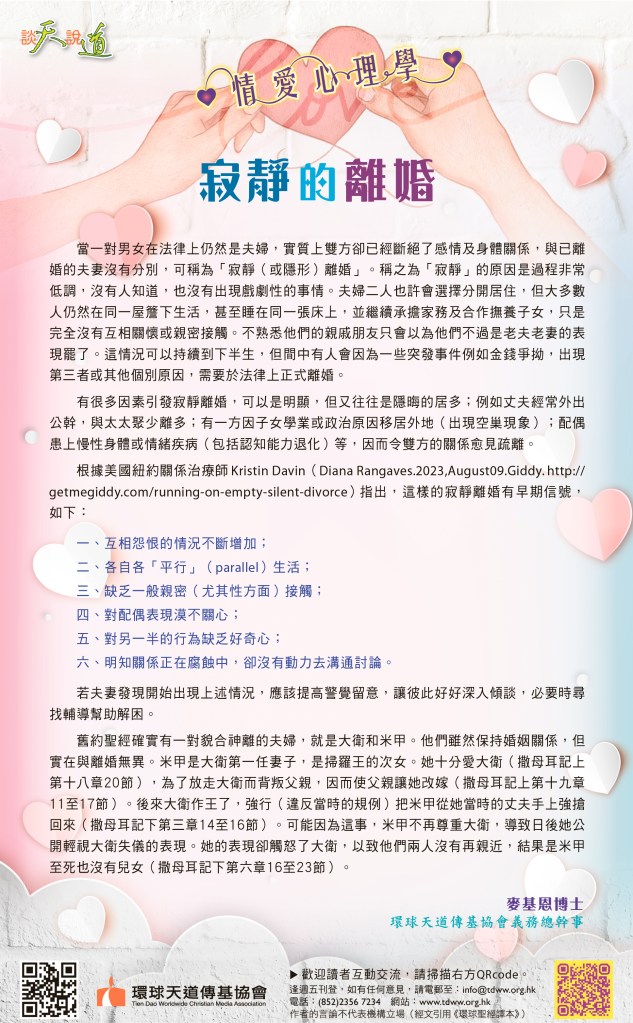 若夫妻發現開始出現上述情況,應該提高警覺留意,讓彼此好好深入傾談,必要時尋找輔導幫助解困。