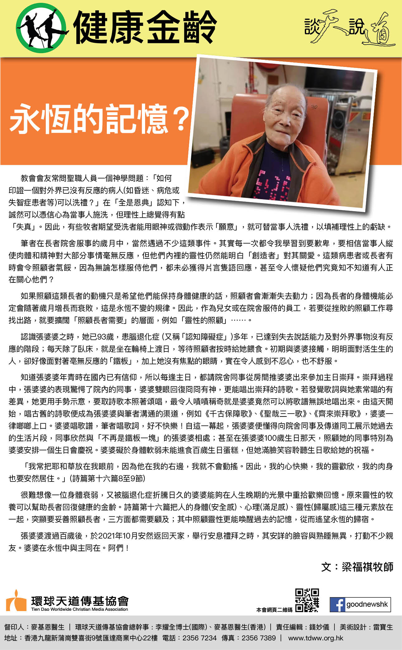 很難想像一位身體衰弱,又被腦退化症折騰日久的婆婆能夠在人生晚期的光景中重拾歡樂回憶。原來靈性的牧養可以幫助長者回復健康的金齡。詩篇第十六篇把人的身體(安全感)、心理(滿足感)、靈性(歸屬感)這三種元素放在一起,突顯要妥善照顧長者,三方面都需要顧及;其中照顧靈性更能喚醒過去的記憶,從而遙望永恆的歸宿。