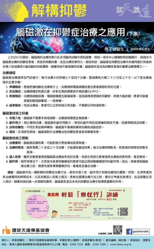 上文(24/12)提到,腦磁激的治療效果已在多項臨床試驗中得到證實,例如一項多中心隨機對照試驗顯示,經過多次腦磁激治療的抑鬱症患者,其症狀明顯改善,並且治療效果持久。總括來說,腦磁激在抑鬱症治療中的應用基於其能夠非侵入性地調控大腦活動的技術優勢。隨著技術不斷發展和完善,腦磁激有望成為抑鬱症患者的重要治療選擇之一。