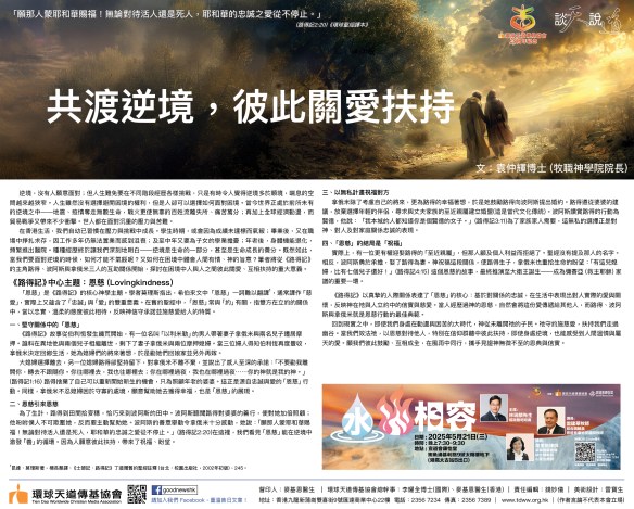 回到現實之中,即使我們身處在動盪與困苦的大時代,神從未離開祂的子民。祂守約施慈愛,扶持我們走過幽谷。當我們效法祂,以恩慈對待他人,特別在信仰群體中彼此扶持,即使身處逆境,也能感受到人間溫情與屬天的愛。願我們彼此鼓勵、互相成全,在風雨中同行,攜手見證神無微不至的恩典與信實。