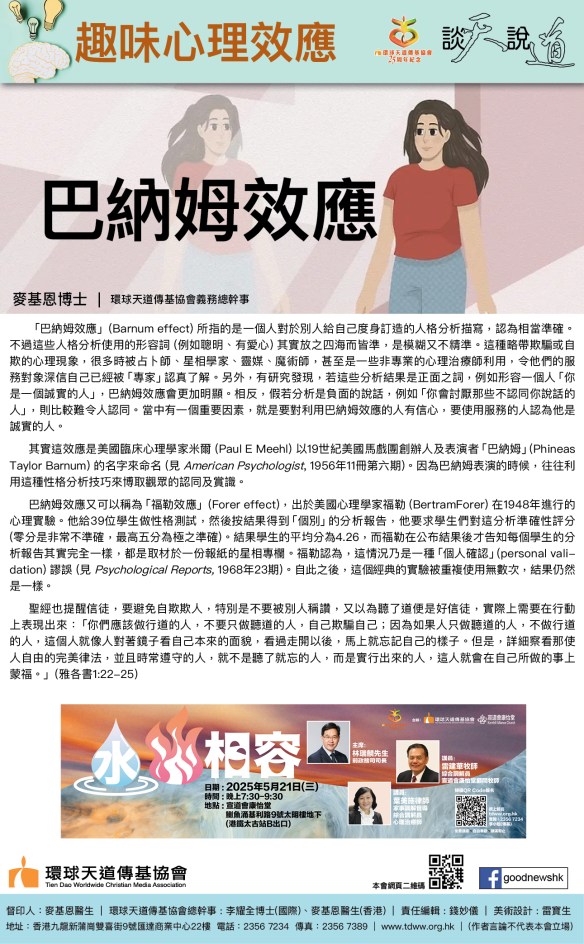 「巴納姆效應」(Barnum effect)所指的是一個人對於別人給自己度身訂造的人格分析描寫,認為相當準確。不過這些人格分析使用的形容詞(例如聰明、有愛心)其實放之四海而皆準,是模糊又不精準。這種略帶欺騙或自欺的心理現象,很多時被占卜師、星相學家、靈媒、魔術師,甚至是一些非專業的心理治療師利用,令他們的服務對象深信自己已經被「專家」認真了解。另外,有研究發現,若這些分析結果是正面之詞,例如形容一個人「你是一個誠實的人」,巴納姆效應會更加明顯。相反,假若分析是負面的說話,例如「你會討厭那些不認同你說話的人」,則比較難令人認同。當中有一個重要因素,就是要對利用巴納姆效應的人有信心,要使用服務的人認為他是誠實的人。