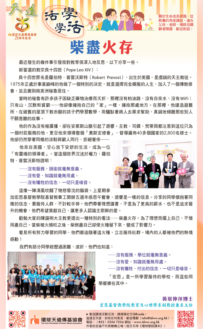 勸勉大家的陳謳明大主教更提出一種特別的看法──柴盡火存。為了理想而擺上自己,不惜用盡自己。當柴被火燒旺之後,柴燃盡自己卻使火種留下來,變成了影響力。