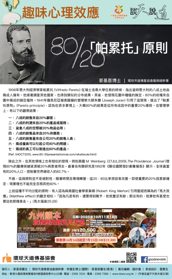 1906年意大利經濟學家帕累托(Vilfredo Pareto)在瑞士洛桑大學任教的時候,指出當時意大利的八成土地由兩成人擁有。他接著調查其他國家,也得到類似的分布結果。其後,他發現花園中種植的豌豆,80%的收穫來自園中兩成的豌豆植珠。1941年羅馬尼亞裔美國籍的管理學大師朱蘭(Joseph Juran)引用了這發現,提出了「帕累托原則」(Pareto principle),認為在很多事情上,大概80%的結果是從所有成因中的重要20%導致。在管理學上,有以下的觀察結果: