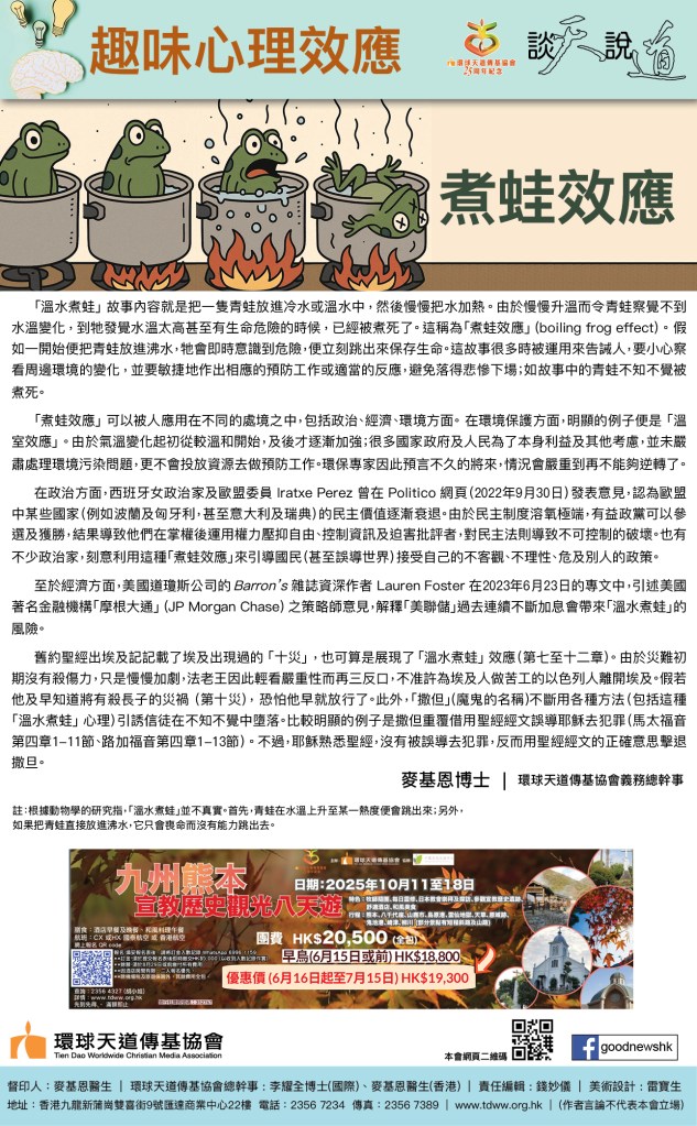 註:根據動物學的研究指,「溫水煮蛙」並不真實。首先,青蛙在水溫上升至某一熱度便會跳出來;另外,如果把青蛙直接放進沸水,它只會喪命而沒有能力跳出去。