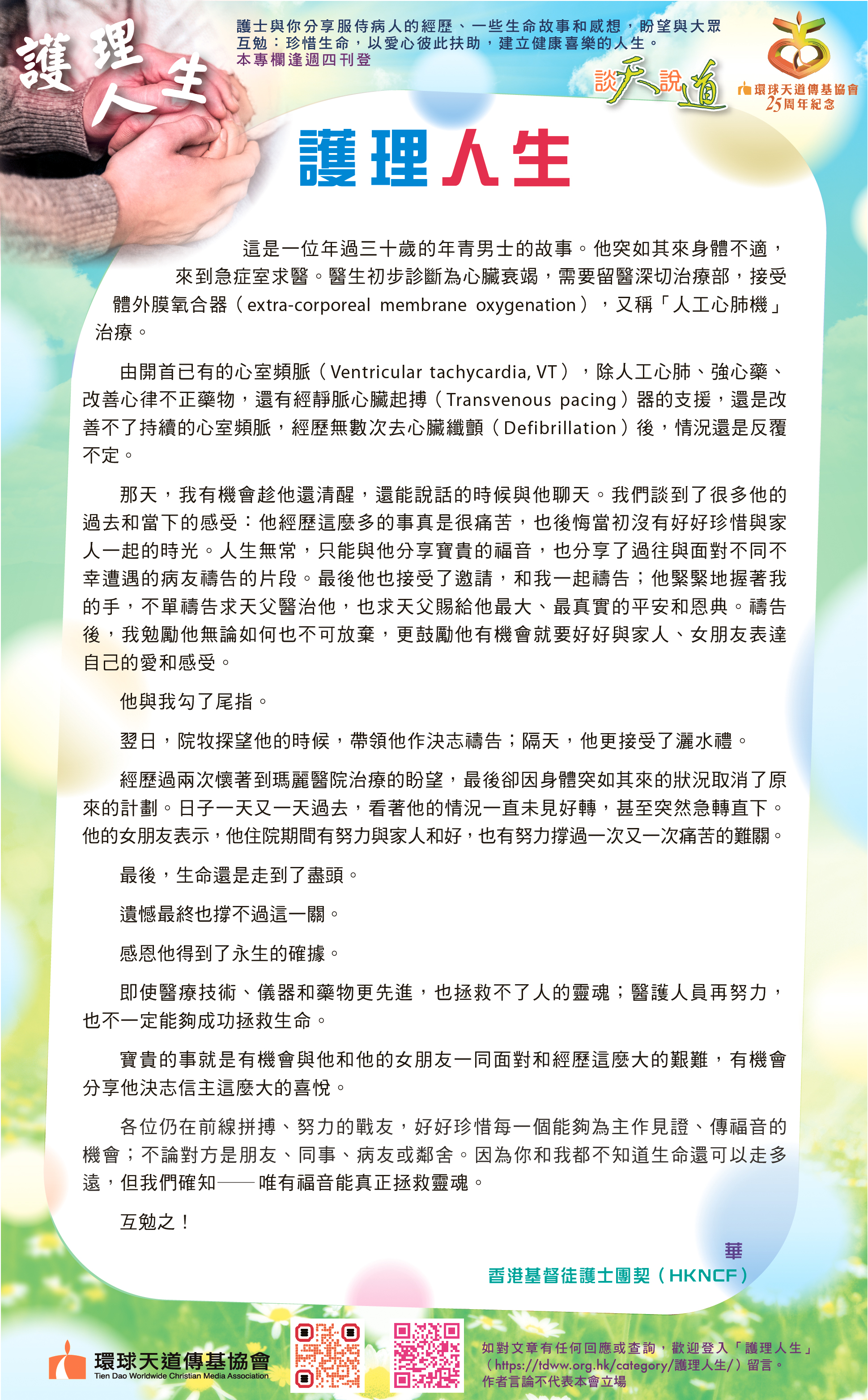 那天,我有機會趁他還清醒,還能說話的時候與他聊天。我們談到了很多他的過去和當下的感受:他經歷這麼多的事真是很痛苦,也後悔當初沒有好好珍惜與家人一起的時光。人生無常,只能與他分享寶貴的福音,也分享了過往與面對不同不幸遭遇的病友禱告的片段。最後他也接受了邀請,和我一起禱告;他緊緊地握著我的手,不單禱告求天父醫治他,也求天父賜給他最大、最真實的平安和恩典。禱告後,我勉勵他無論如何也不可放棄,更鼓勵他有機會就要好好與家人、女朋友表達自己的愛和感受。