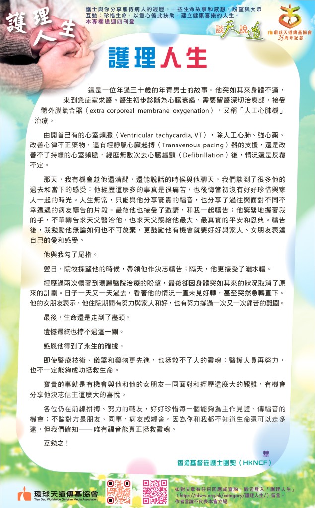 各位仍在前線拼搏、努力的戰友,好好珍惜每一個能夠為主作見證、傳福音的機會;不論對方是朋友、同事、病友或鄰舍。因為你和我都不知道生命還可以走多遠,但我們確知──唯有福音能真正拯救靈魂。