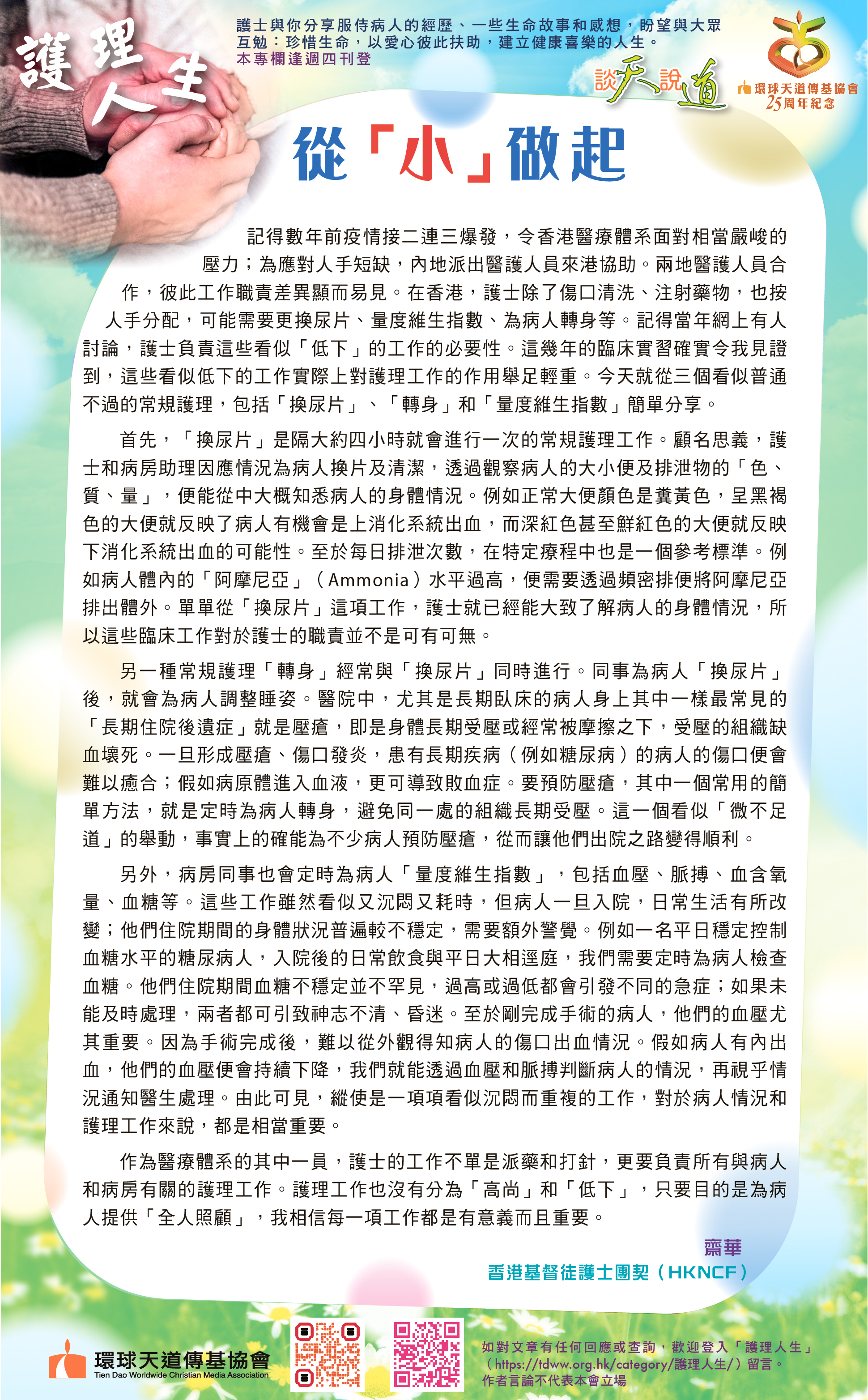 作為醫療體系的其中一員,護士的工作不單是派藥和打針,更要負責所有與病人和病房有關的護理工作。護理工作也沒有分為「高尚」和「低下」,只要目的是為病人提供「全人照顧」,我相信每一項工作都是有意義而且重要。
