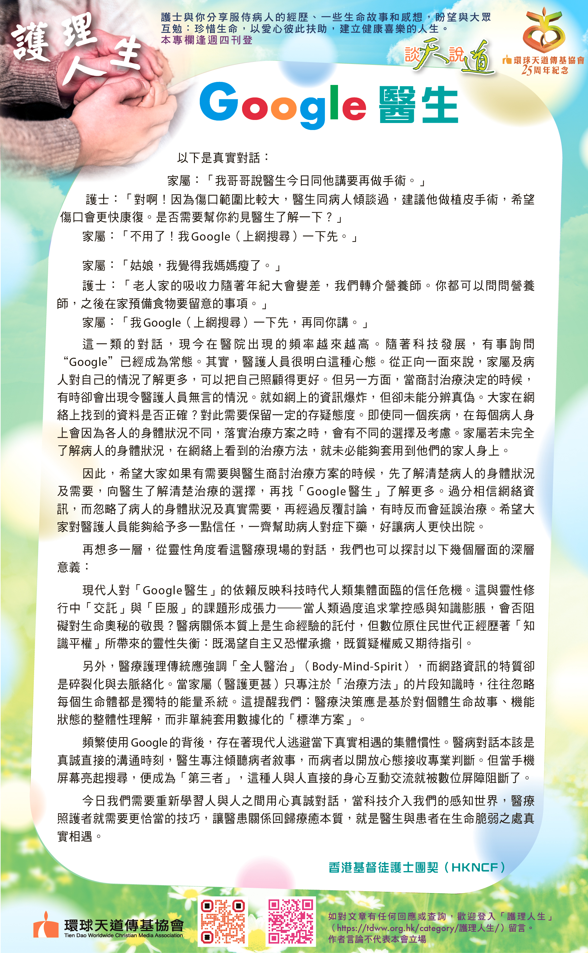 因此,希望大家如果有需要與醫生商討治療方案的時候,先了解清楚病人的身體狀況及需要,向醫生了解清楚治療的選擇,再找「Google醫生」了解更多。過分相信網絡資訊,而忽略了病人的身體狀況及真實需要,再經過反覆討論,有時反而會延誤治療。希望大家對醫護人員能夠給予多一點信任,一齊幫助病人對症下藥,好讓病人更快出院。