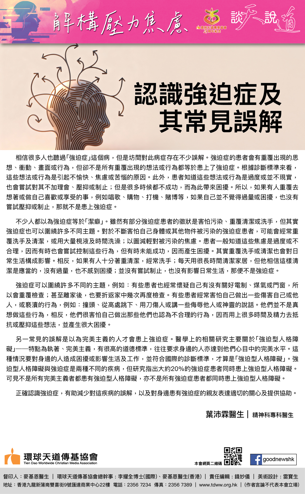 正確認識強迫症,有助減少對這疾病的誤解,以及對身邊患有強迫症的親友表達適切的關心及提供協助。