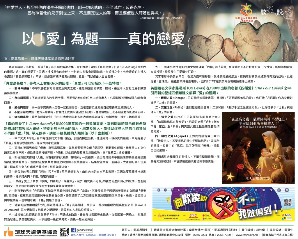 臨近聖誕節,多數有一些以「愛」為主題的電視片集、電影推出。電影《真的戀愛了》(Love Actually)是熱門的重播之選。真的戀愛了,又遇上情投意合的良伴,一對戀人多數會談婚論嫁。在婚禮之中,有些證婚的主禮人會講到「真愛是甚麼?」不過,這是沒有標準答案的問題;故此,可以任由人自由發揮。
