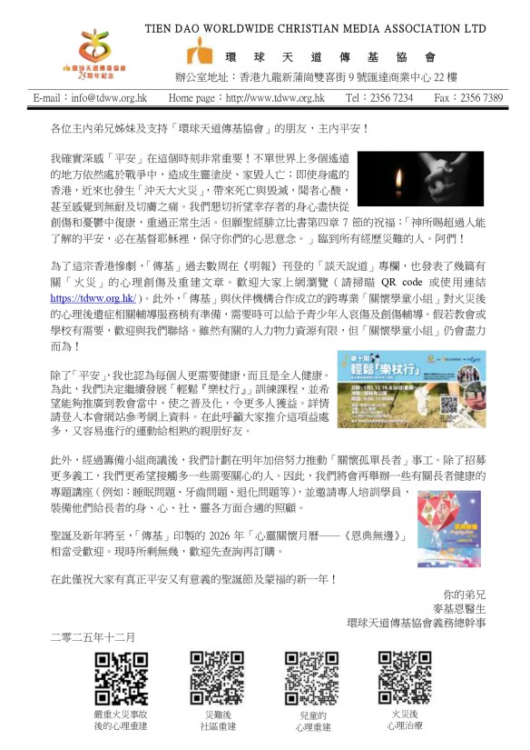 為了這宗香港慘劇,「傳基」過去數周在《明報》刊登的「談天說道」專欄,也發表了幾篇有關「火災」的心理創傷及重建文章。歡迎大家上網瀏覽(請掃瞄QR code或使用連結https://tdww.org.hk/ )。此外,「傳基」與伙伴機構合作成立的跨專業「關懷學童小組」對火災後的心理後遺症相關輔導服務稍有準備,需要時可以給予青少年人哀傷及創傷輔導。假若教會或學校有需要,歡迎與我們聯絡。雖然有關的人力物力資源有限,但「關懷學童小組」仍會盡力而為!