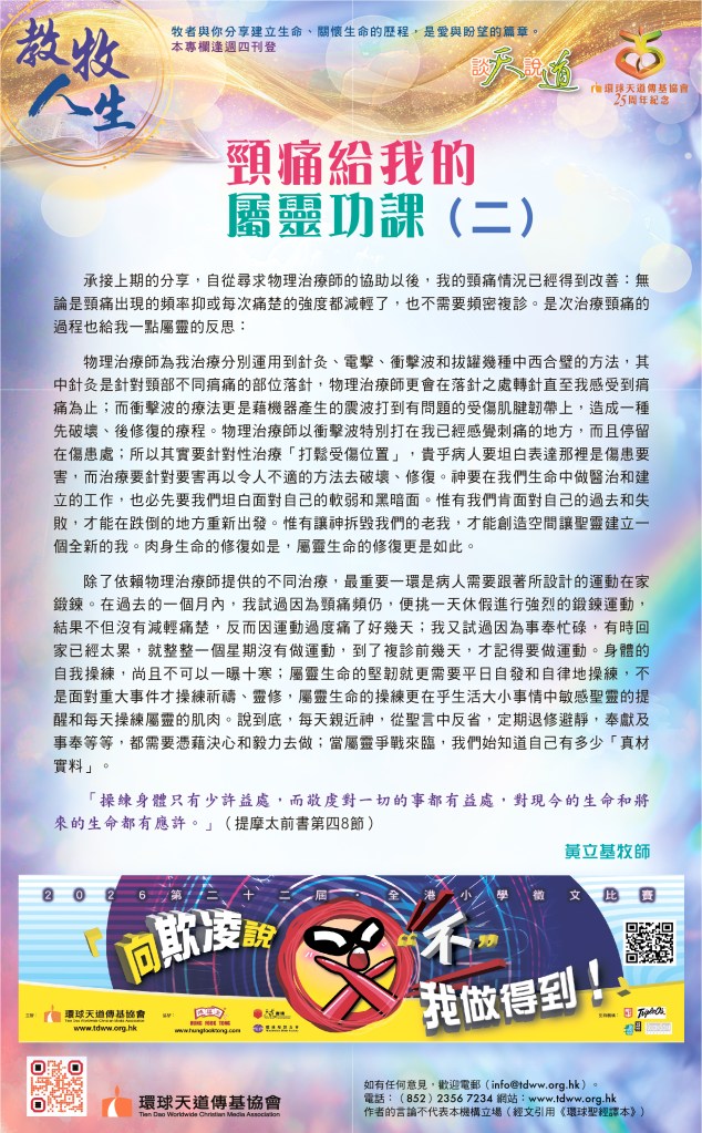 除了依賴物理治療師提供的不同治療,最重要一環是病人需要跟著所設計的運動在家鍛鍊。在過去的一個月內,我試過因為頸痛頻仍,便挑一天休假進行強烈的鍛鍊運動,結果不但沒有減輕痛楚,反而因運動過度痛了好幾天;我又試過因為事奉忙碌,有時回家已經太累,就整整一個星期沒有做運動,到了複診前幾天,才記得要做運動。身體的自我操練,尚且不可以一曝十寒;屬靈生命的堅韌就更需要平日自發和自律地操練,不是面對重大事件才操練祈禱、靈修,屬靈生命的操練更在乎生活大小事情中敏感聖靈的提醒和每天操練屬靈的肌肉。說到底,每天親近神,從聖言中反省,定期退修避靜,奉獻及事奉等等,都需要憑藉決心和毅力去做;當屬靈爭戰來臨,我們始知道自己有多少「真材實料」。