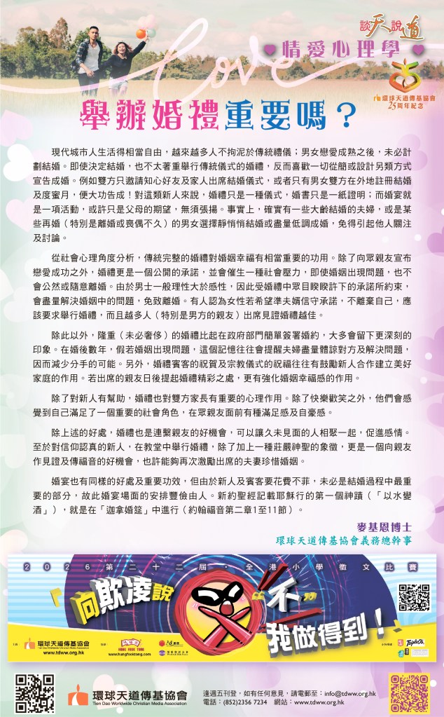 除上述的好處,婚禮也是連繫親友的好機會,可以讓久未見面的人相聚一起,促進感情。至於對信仰認真的新人,在教堂中舉行婚禮,除了加上一種莊嚴神聖的象徵,更是一個向親友作見證及傳福音的好機會,也許能夠再次激勵出席的夫妻珍惜婚姻。