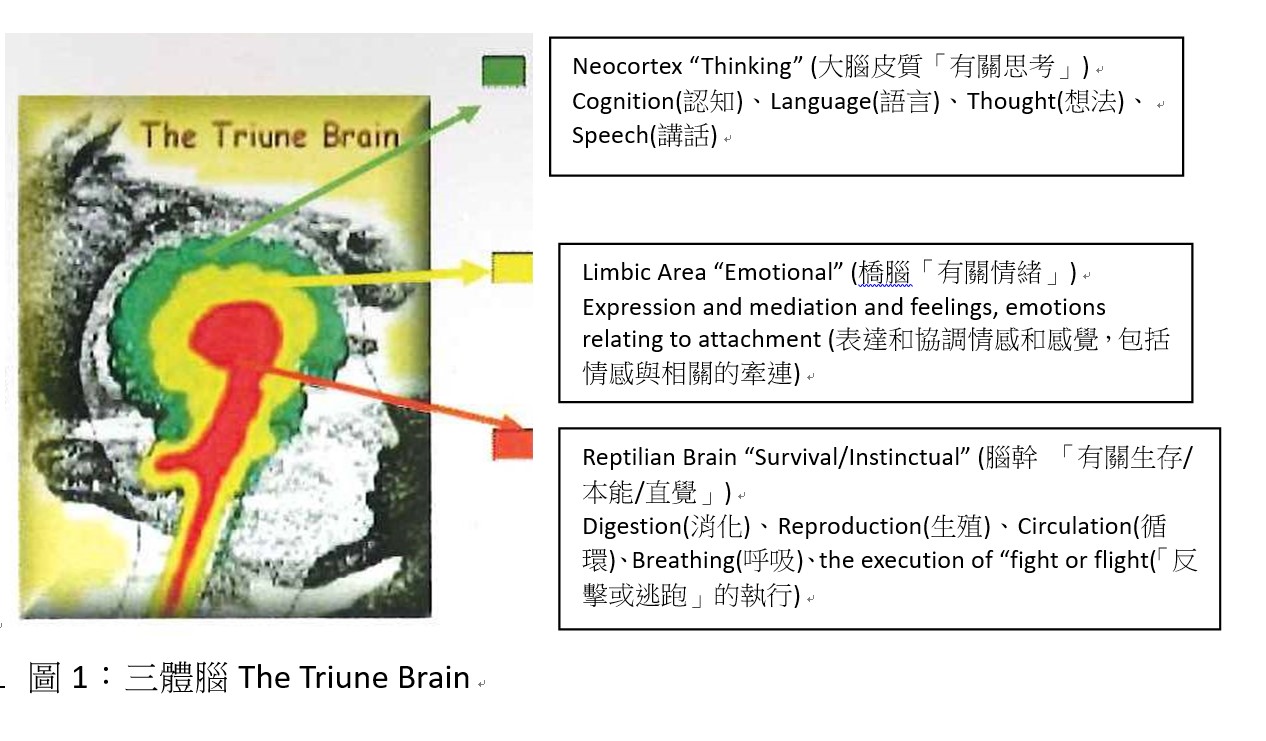 Bill Bowen[4](鮑恩)、Daniel Siegel[5](西格爾)、Peter Levin[6](列文)三位在近二十年來於創傷治療與心理治療上作出創新而突破的做法並有新發現,他們亦同時影響到心理治療的切入方法。他們都認為人腦有三個部分,這較以往的左腦右腦更為深入,解說人行為背後的策劃與控制方法。(圖1)[7]在圖中所顯示的三個區域,Neo-Cortex(大腦皮質)是後天語言與理性的部分,是三個部分中最依賴語言能力來發展的,也是最遲發展的部分。行為治療法中駁斥非理性思想的理論架構中,是十分強調這部分的控制能力的做法。以往我們在處理許多創傷個案中,當事人出現解離現象,突然失控,掉落在失控、驚惶失措之中。如果單單倚重語言來治療是不足夠的。對許多創傷來說,創傷只是一部分的問題,往往個人的心理建構對當事人的復原有很深遠的影響,所以我們更需要認識管理情感、反應的部分,即是腦的第二個區域──橋腦(Limbic Area)。