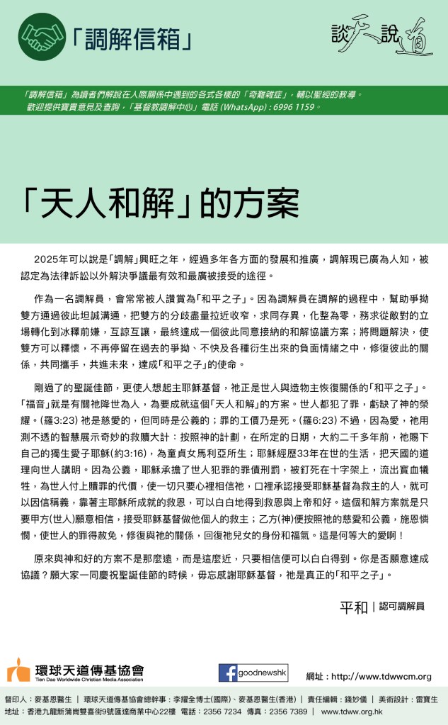 剛過了的聖誕佳節,更使人想起主耶穌基督,祂正是世人與造物主恢復關係的「和平之子」。「福音」就是有關祂降世為人,為要成就這個「天人和解」的方案。世人都犯了罪,虧缺了神的榮耀。(羅馬書3章23節)祂是慈愛的,但同時是公義的;罪的工價乃是死。(羅馬書6章23節)不過,因為愛,祂用測不透的智慧展示奇妙的救贖大計:按照神的計劃,在所定的日期,大約二千多年前,祂賜下自己的獨生愛子耶穌(約翰福音3章16節),為童貞女馬利亞所生;耶穌經歷33年在世的生活,把天國的道理向世人講明。因為公義,耶穌承擔了世人犯罪的罪債刑罰,被釘死在十字架上,流出寳血犧牲,為世人付上贖罪的代價,使一切只要心裡相信祂,口裡承認接受耶穌基督為救主的人,就可以因信稱義,靠著主耶穌所成就的救恩,可以白白地得到救恩與上帝和好。這個和解方案就是只要甲方(世人)願意相信,接受耶穌基督做他個人的救主;乙方(神)便按照祂的慈愛和公義,施恩憐憫,使世人的罪得赦免,修復與祂的關係,回復祂兒女的身份和福氣。這是何等大的愛啊!