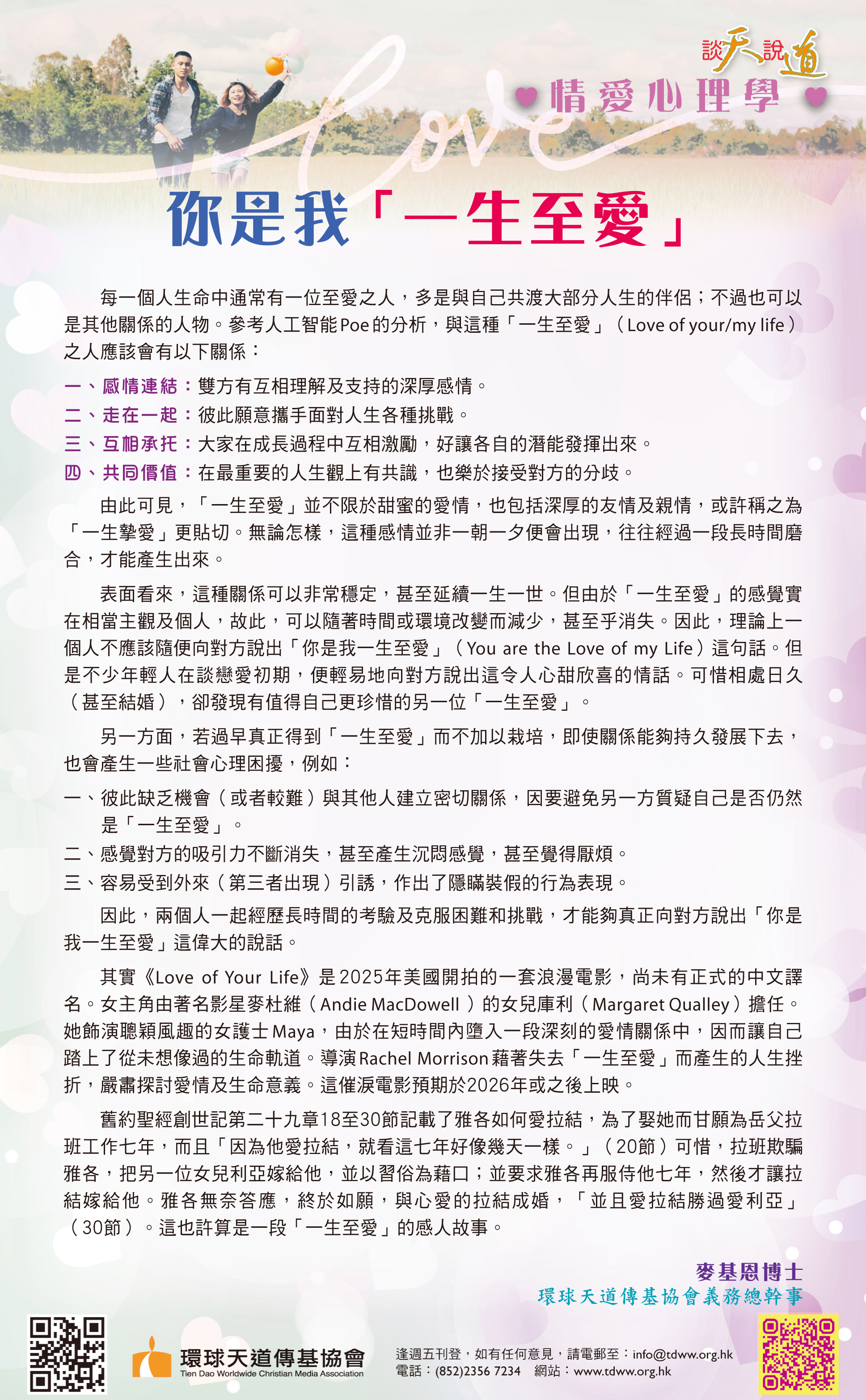 由此可見,「一生至愛」並不限於甜蜜的愛情,也包括深厚的友情及親情,或許稱之為「一生摯愛」更貼切。無論怎樣,這種感情並非一朝一夕便會出現,往往經過一段長時間磨合,才能產生出來。