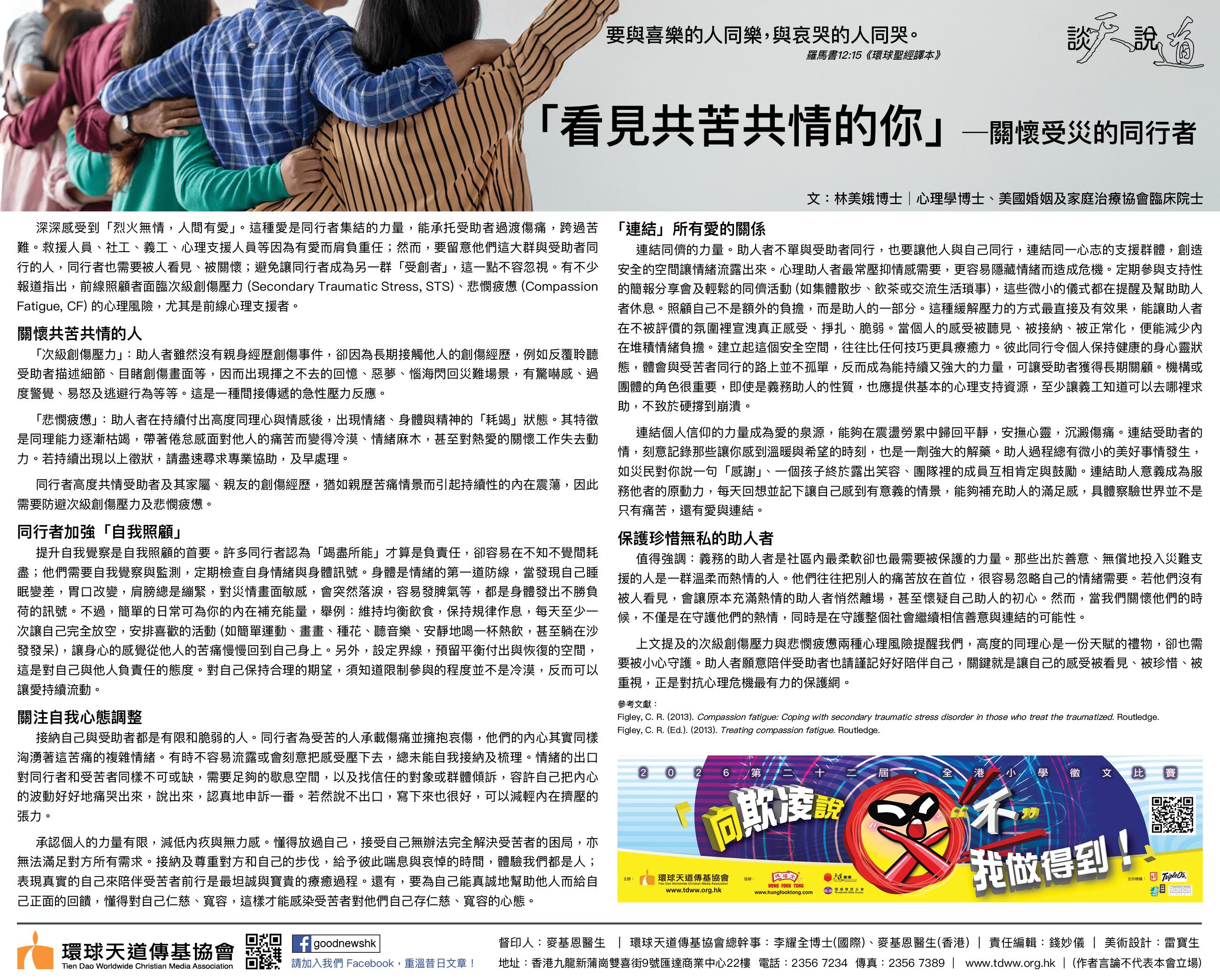 深深感受到「烈火無情,人間有愛」。這種愛是同行者集結的力量,能承托受助者過渡傷痛,跨過苦難。救援人員、社工、義工、心理支援人員等因為有愛而肩負重任;然而,要留意他們這大群與受助者同行的人,同行者也需要被人看見、被關懷;避免讓同行者成為另一群「受創者」,這一點不容忽視。有不少報道指出,前線照顧者面臨次級創傷壓力(Secondary Traumatic Stress, STS)、悲憫疲憊(Compassion Fatigue, CF)的心理風險,尤其是前線心理支援者。