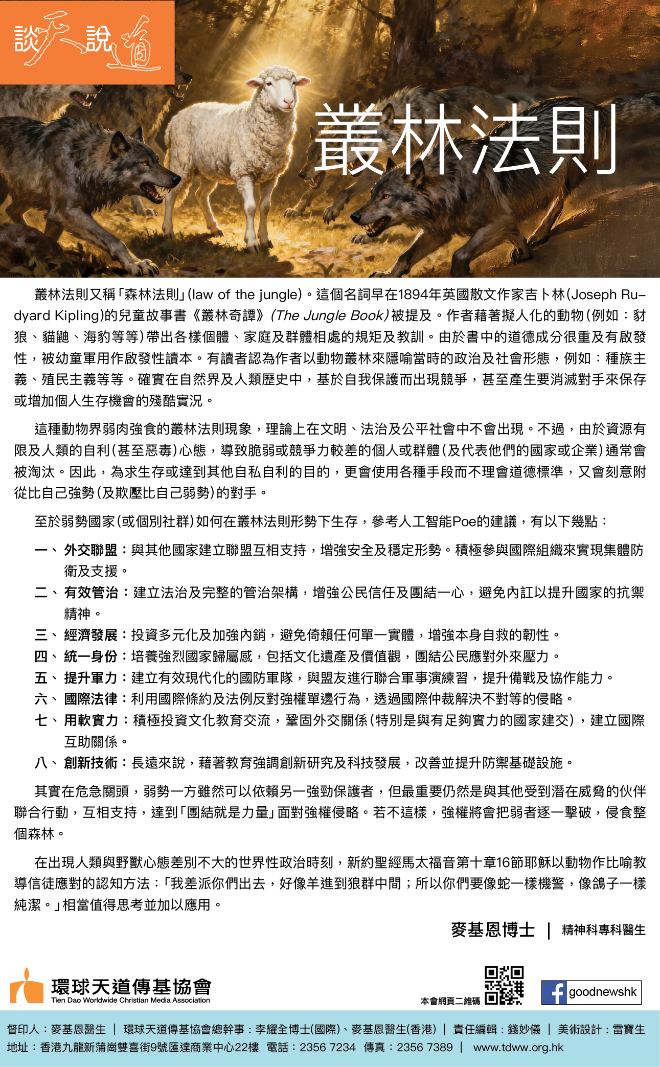 在出現人類與野獸心態差別不大的世界性政治時刻,新約聖經馬太福音第十章16節耶穌以動物作比喻教導信徒應對的認知方法:「我差派你們出去,好像羊進到狼群中間;所以你們要像蛇一樣機警,像鴿子一樣純潔。」是相當值得思考並加以應用。